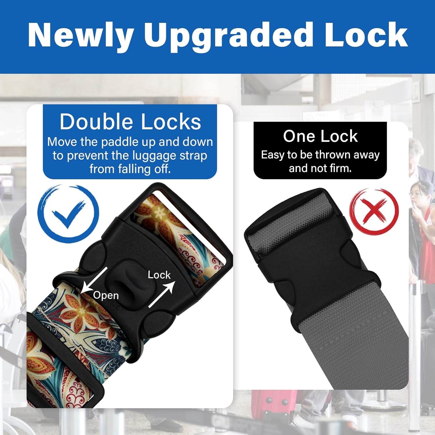 - [THOUGHTFUL DESIGN]: Doouble Lock+Adjustable+Portable+Lightweight+Sturdy Buckle.The adjustable luggage strap is equipped with a buckle that has a double lock. You need to slide up and down to unlock and open it, and then press the release buckle to quickly release and open it, ensuring the safety of your luggage. It is very convenient and practical!The luggage strap is lightweight, very portable, and very convenient to use