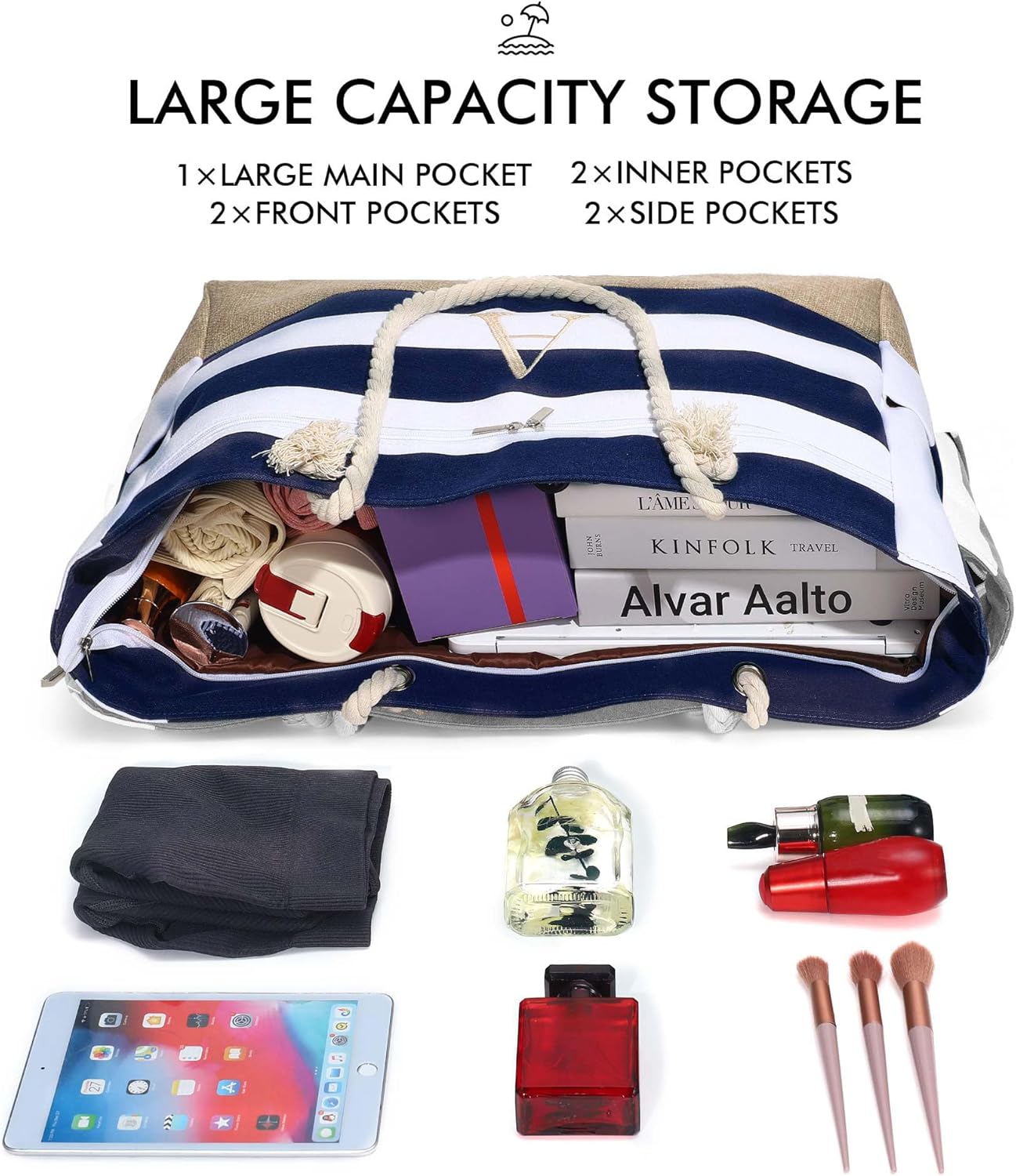 YOOLIFE Large Initial Beach Bag Waterproof Tote Zipper Bag Personalized Gifts for Women Her Birthday Travel Beach Essential