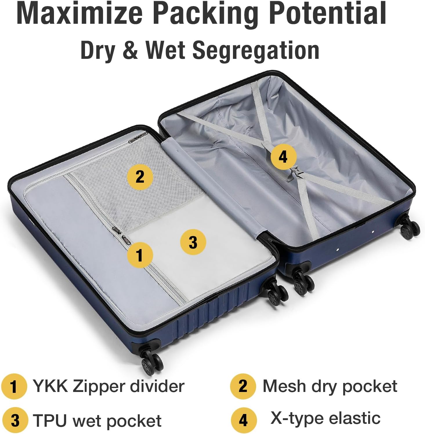 - Spacious Interior: With dimensions of 20.18x11.42x32.28 inches, this luggage provides ample packing space for medium to long trips. The interior includes a large zippered compartment, a wet-dry separation area, and strong X-type elastic straps to keep your belongings secure and neatly organized.