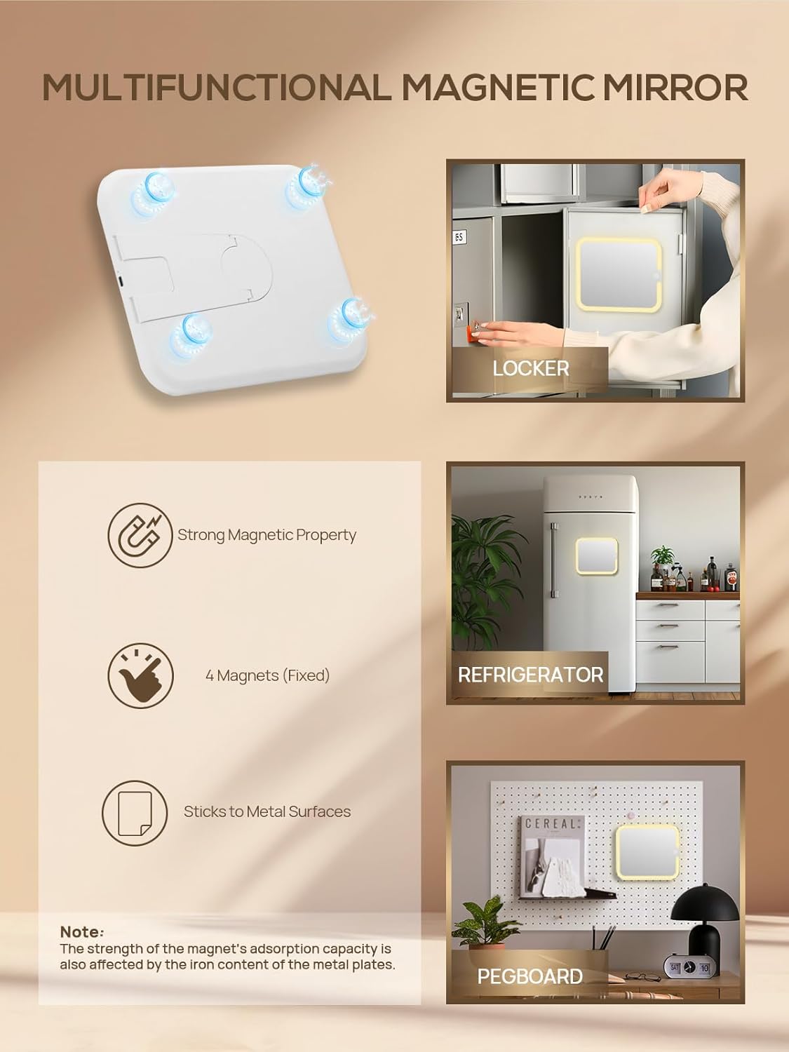 • 【Removable Travel Mirror】This travel mirror with light is built-in 4 strong magnets. Unique design making them easy to install, which can be applied directly to anywhere ironwork surfaces. Great fits for various makeup occasions: school locker, office, bookshelf, etc