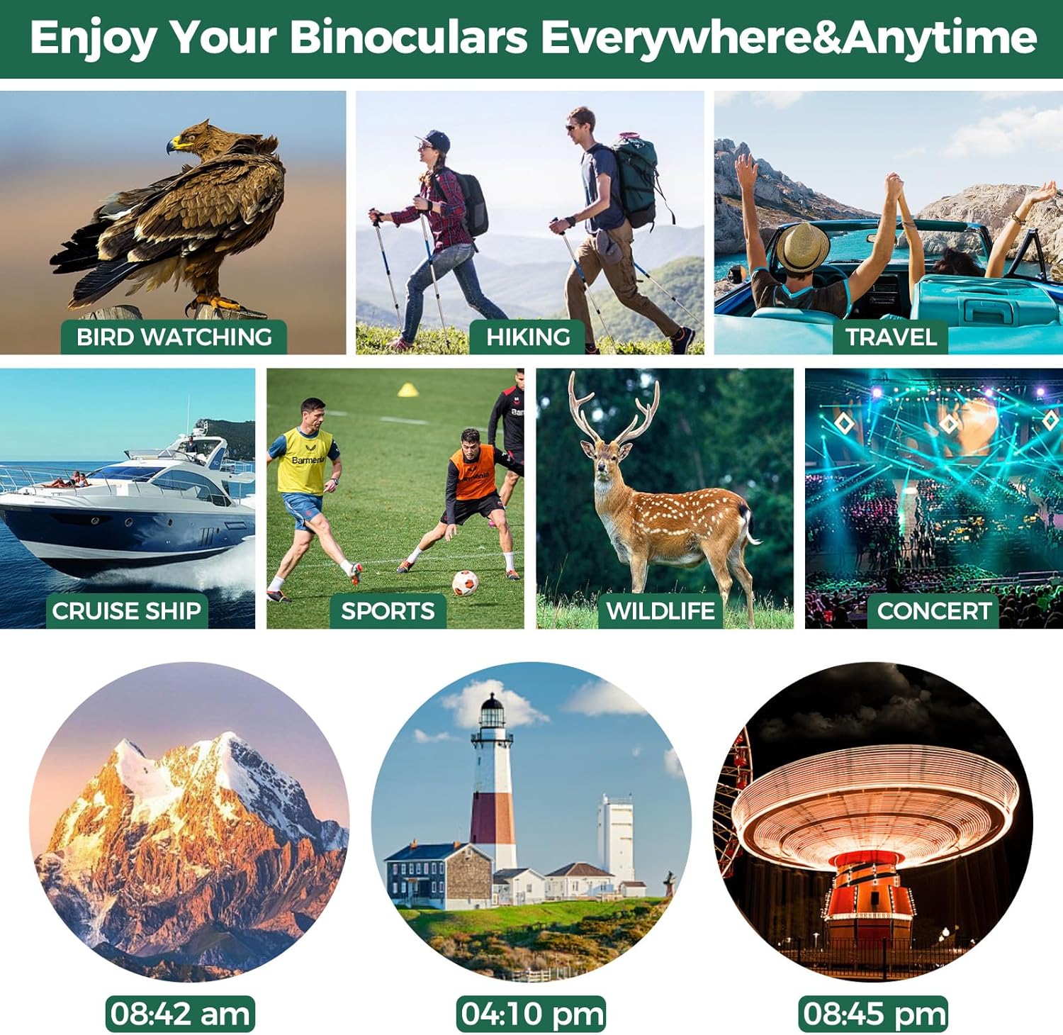 - 【BINOCULARS WITH PHONE ADAPTER】:Phone adapter allowing you to securely attach your phone for long-distance photos without a camera zoom. You can share them with friends and family and store the precious memories. A strap, carrying bag, ocular lens cap and cleaning cloth are included too.