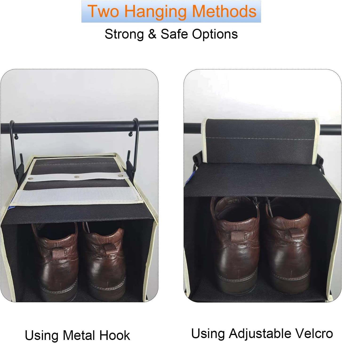 - 【Two Hanging Methods】 - The hanging shoe organizer for closet fits perfectly in any closet, firstly two sturdy metal hooks to hold up on a clothes rack pole or shower rod whichever you want to hang it up, secondly the velcro strap is adjustable to fit any size closet bar. Two ways considerable and necessary for your free options and satisfactions at any time.