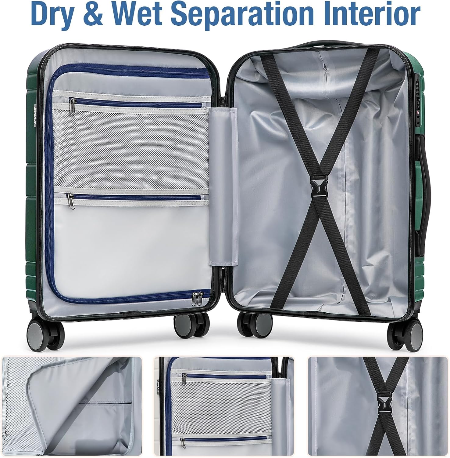- SPACIOUS INTERIOR: These hardshell 22x14x9 carryon luggage has multiple storage compartments for easy packing. The main compartment has "X"-shaped cross straps to keep clothes in place. The left side compartment has two zipped mesh pockets for wet and dry storage.Soft silicone handles on the top and sides provide a variety of comfortable carrying options
