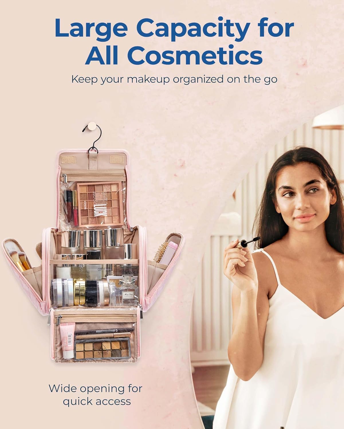 BAGSMART Makeup Bag for Women with Hanging Hook, Large Portable Capacity Water-resistant Organizer Travel Case for Toiletries and Cosmetics, Pink