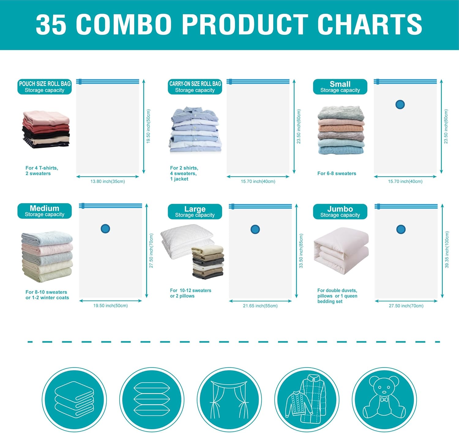 - 35 PACK INCLUDES: 5 Jumbo: 39.35β X 27.5β(100cm X 70cm); 6 Large: 33.5β X 21.65β(85cm X 55cm); 6 Medium: 27.5βX 19.5β(70cm X 50cm); 6 Small: 23.5βX 15.7β (60cm X 40cm); 6 Travel Roll Up (No need vacuum holes): 23.5βX 15.7β (60cm X 40cm)οΌ6 Pouch Sized Travel Roll Up (No need vacuum holes)