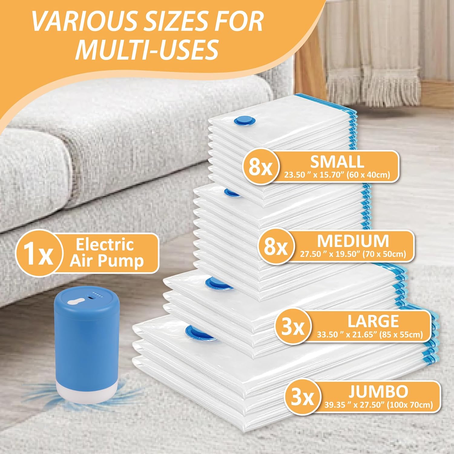 - 22 Combo includes: Our 22 pack space saver bags pack comes with 3 Jumbo: 39.35ββ X 27.5ββ(100cm X 70cm); 3 Large: 33.5ββ X 21.65ββ (85cm X 55cm); 8 Medium: 27.5ββ X 19.5ββ (70cm X 50cm); 8 Small: 23.5ββ X 15.7ββ (60cm X 40cm) and 1 electric air pump.