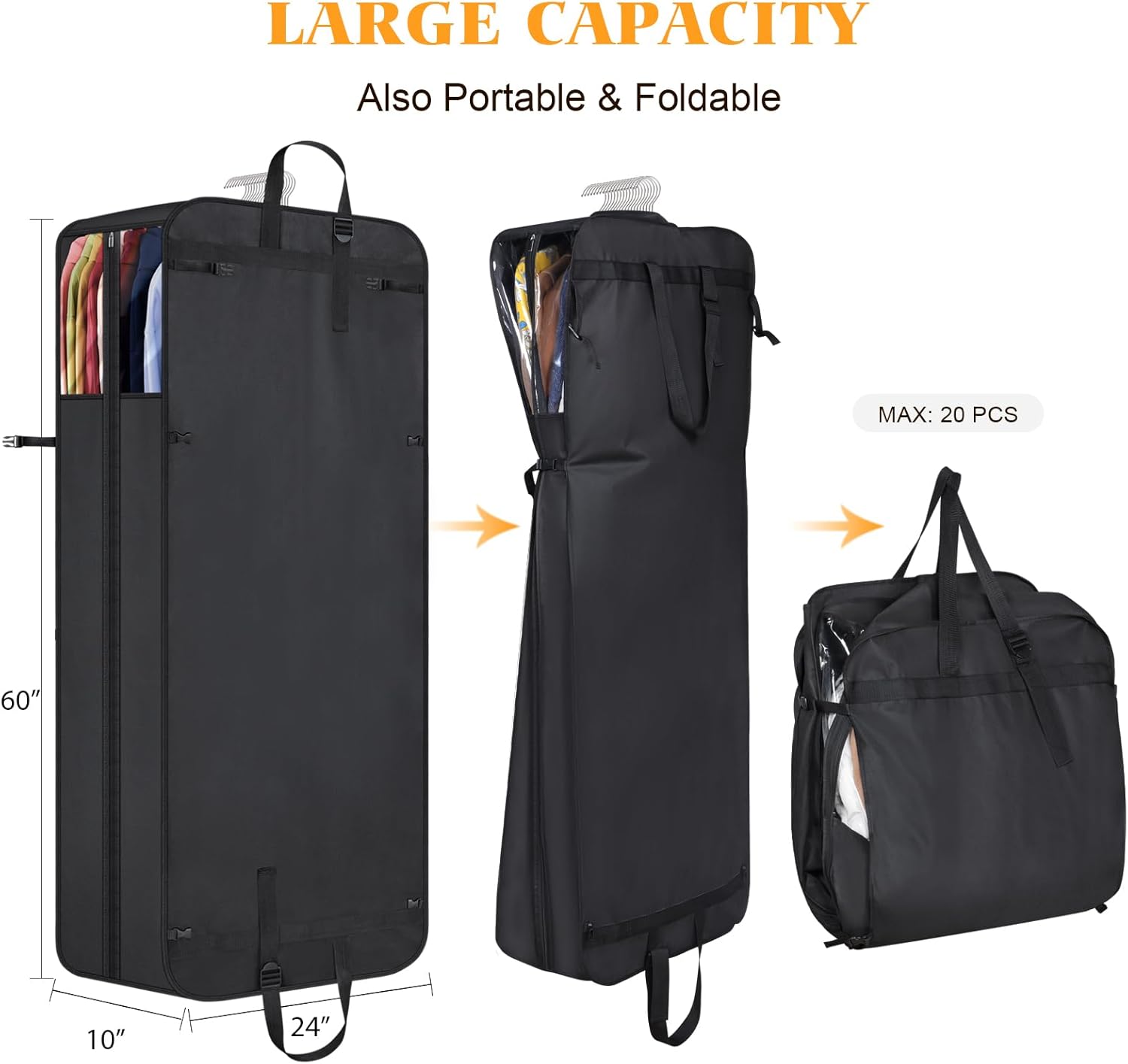 - 【Large Capacity】Our 10" gusseted suit bags for closet storage have a larger and wider capacity allowing more clothing to be stored than normal travel hanging garment bags. Extra large garment bag making it great for storing suits, shirts, dresses, jackets, more than 10 pieces of clothes.