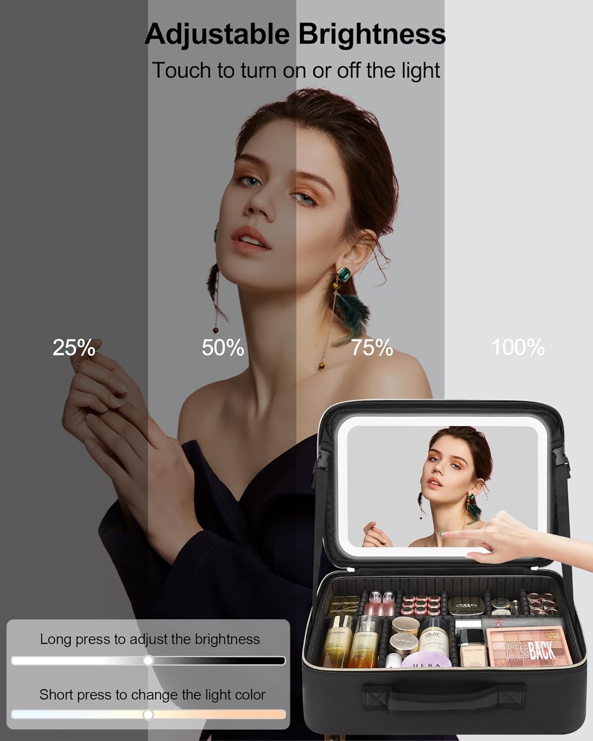 - USB Rechargeable Makeup Mirror: New generation makeup case design with LED makeup mirror, with cold white / natural / warm three-tone settings, and the brightness can be adjusted 0%-100%, which can perfectly meet your different makeup needs and make your makeup more delicate.
