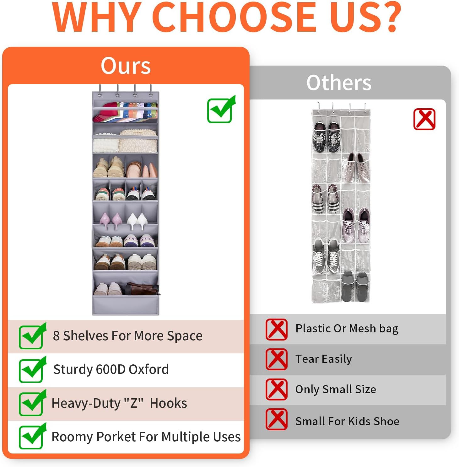 - 8 Shelves Large Capacity: Over the door shoe rack measures 68"H*16.5"L*6"W. (Please measure the height of the door is greater than 71 inches before buying.)Hanging shoe storage with 13 pockets in different sizes can hold more than 22 pairs of shoes.Shoe closet organizer is large and deep enough to store high heels and boots.And back of door shoe organizer is a great home storage organizer and helps to increase more space for over door, closet, wall, dorm, and RV, making your room more tidy and clean.