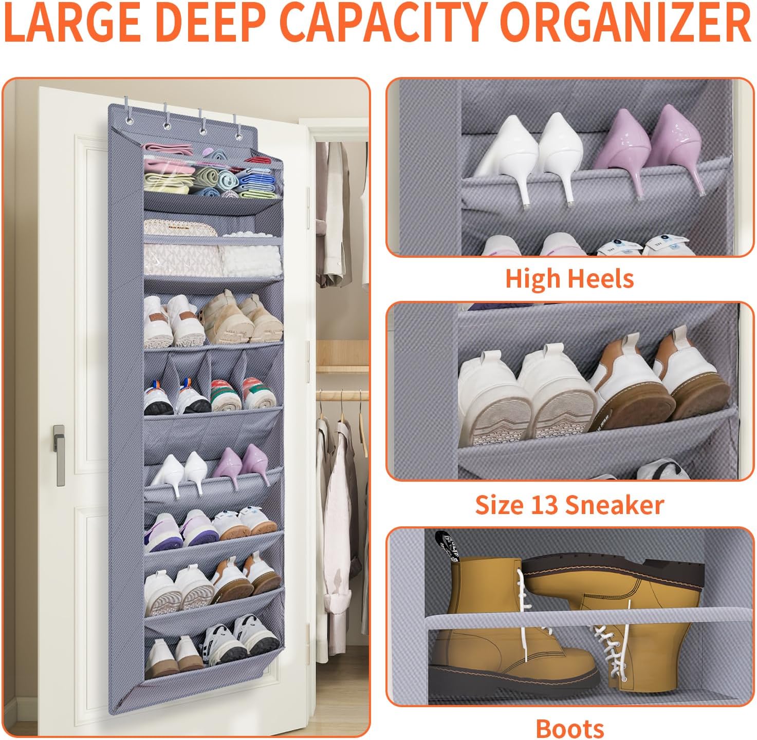 - Larger Deep Pockets: Each hanging shoe organizer for closet has a 9"depth. Designed with 3 styles of pockets meets your different needs. The largest pocket is ideal for men's shoes size 12, and boots size 12. The special up-opening design is convenient for you, and the deep slot and both sides are closed, which could keep the shoes in the pocket without falling out.