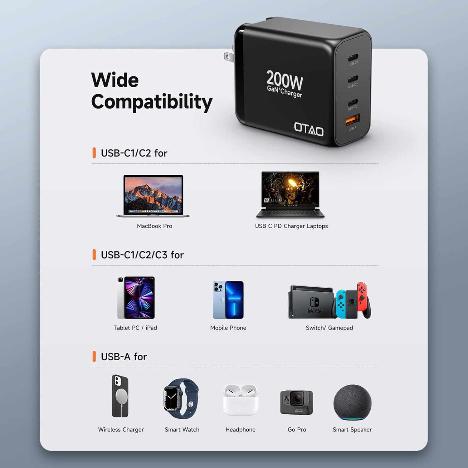 - Charging Station for Multiple Devices with Wide Compatibility: The usb c charger block with 3 USB-C ports and 1 USB-A port, can power 4 devices simultaneously. Suit for laptops(MacBook Pro 16''/15''/14''/13'' Macbook Air/Dell/HP), Phones(iPhone 15/14/13/12/11 Pro Max Mini/SE/XS MAX/XR/Galaxy S24 23 22 21 ultra/Google Pixel 7 Pro/6/5/4/3),Tablets(iPad/Samsung Tab/Google Pixel Slate) and Other electronics (Bluetooth speaker/Headphone/Nintendo Switch/Kindle) ect. Ideal for home, office and travel.