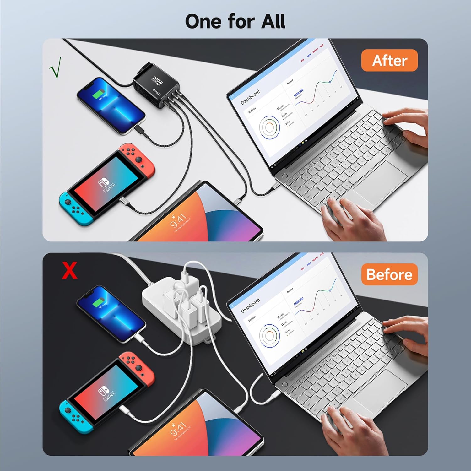 - Powerful 200W Output: This GaN charger delivers a total of 200W, providing rapid and efficient charging for all your devices. And supporting 100W+100W fast charging power for two laptops at the same time, fully charged in about 1 hour. All the devices includes laptop, tablet, smartphone, and other gadgets can enjoy quick and reliable power.