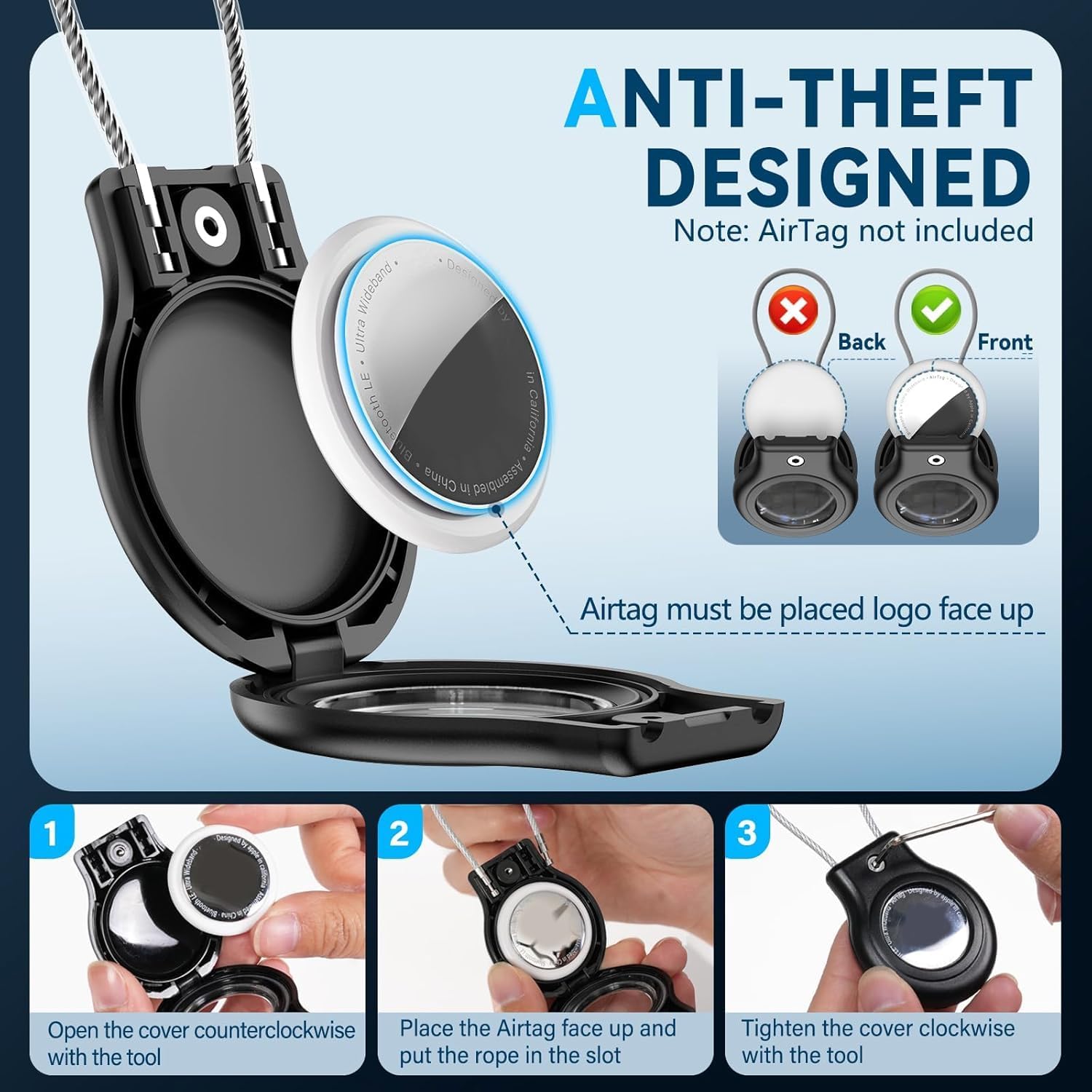 - Easy to Install: just open the holder, Place the Airtag face up and put the rope in the slot,and tighten the screws.(equipped with a hexagonal key specifically designed to open and lock Airtag cases)