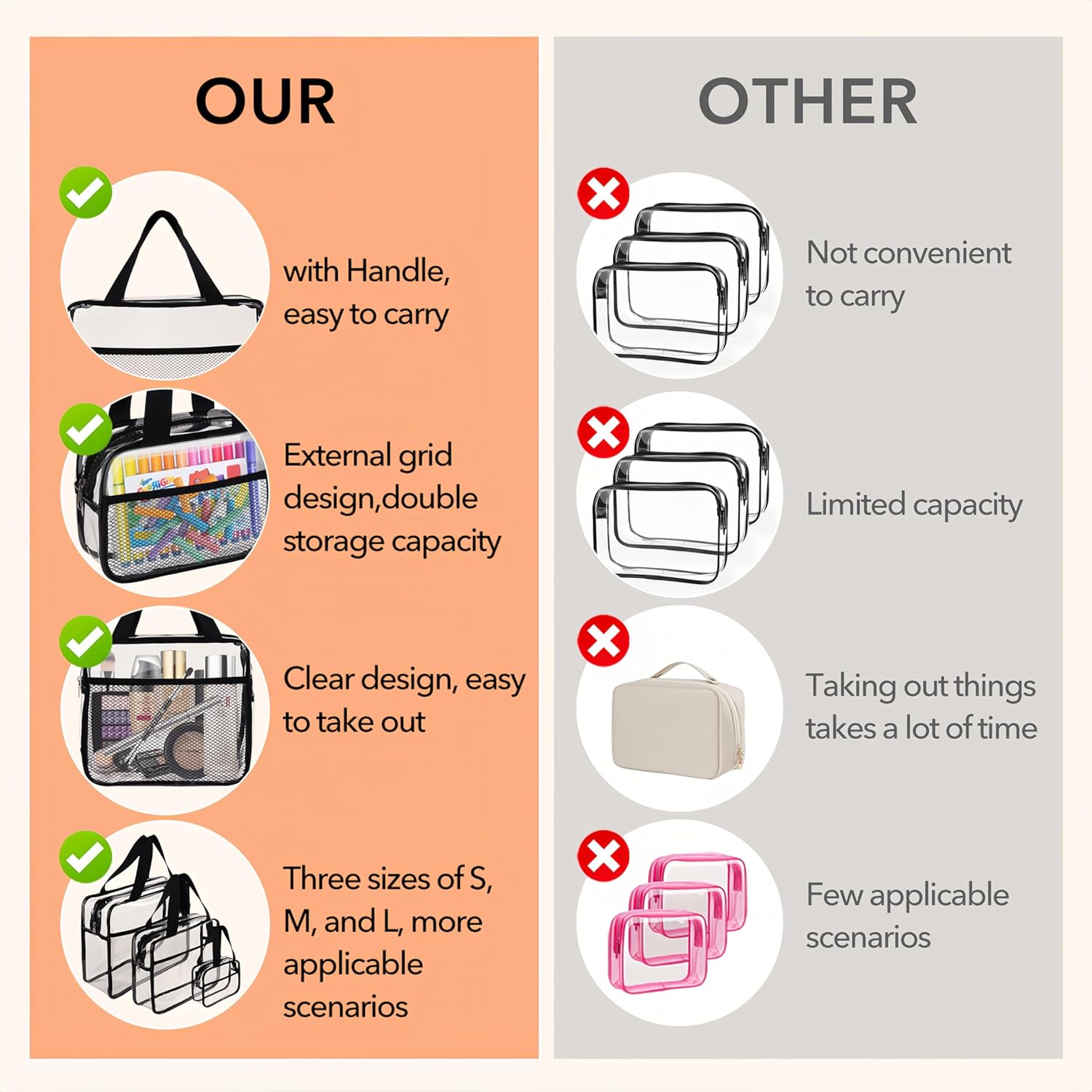 - 【Clear & TSA Approved for Travel】XEWEA 3 Pack Clear Toiletry Bags are following TSA 3-1-1 rules.and in order to meet the needs of different occasions, we have designed 3 sizes—Large (12 x 9.4 x 3.5 in), Medium (9.8 x 8.3 x 2.8 in), and Small (7.5 x 5.9 x 2.4 in). ❀Therefore, please check the sizes before purchasing to avoid inconvenience. Thanks!❀