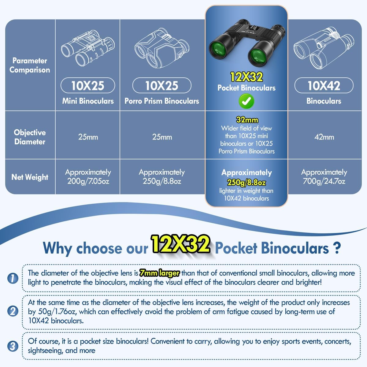12x32 Binoculars Compact for Adults - High Powered Binoculars for Bird Watching Travel Spectator Sport Fishing Golf