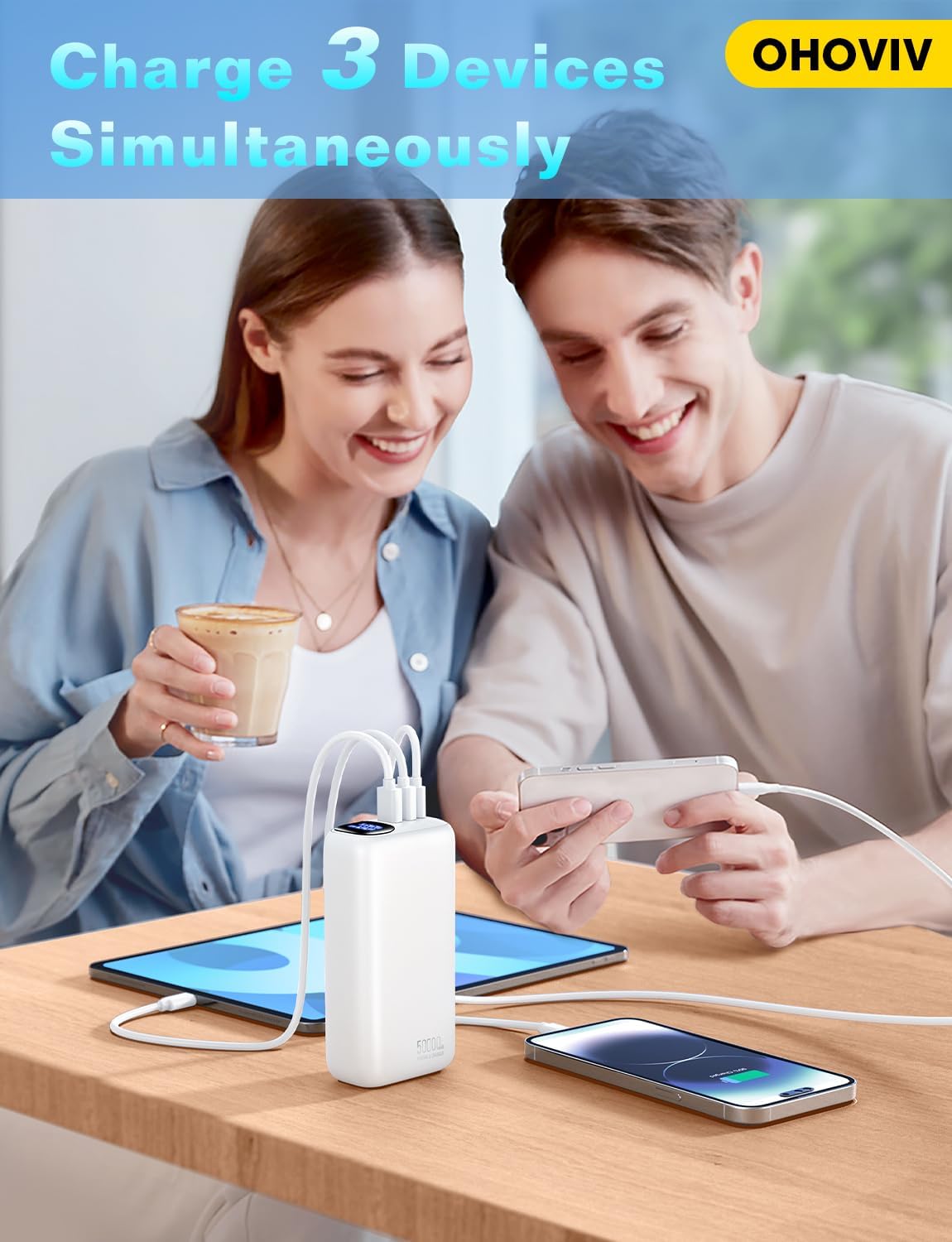 - 【Latest PD 22.5W High-Speed Charging】OHOVIV 50000mAh Portable phone charger adopts the latest Super Charger Protocol and Fast Charger Protocol with 22.5W output USB-C port.Support QC4.0 QC3.0 high-capacity power bank with fast charging, it only takes 30 minutes to charge your iPhone 14 from 0% to 55%.