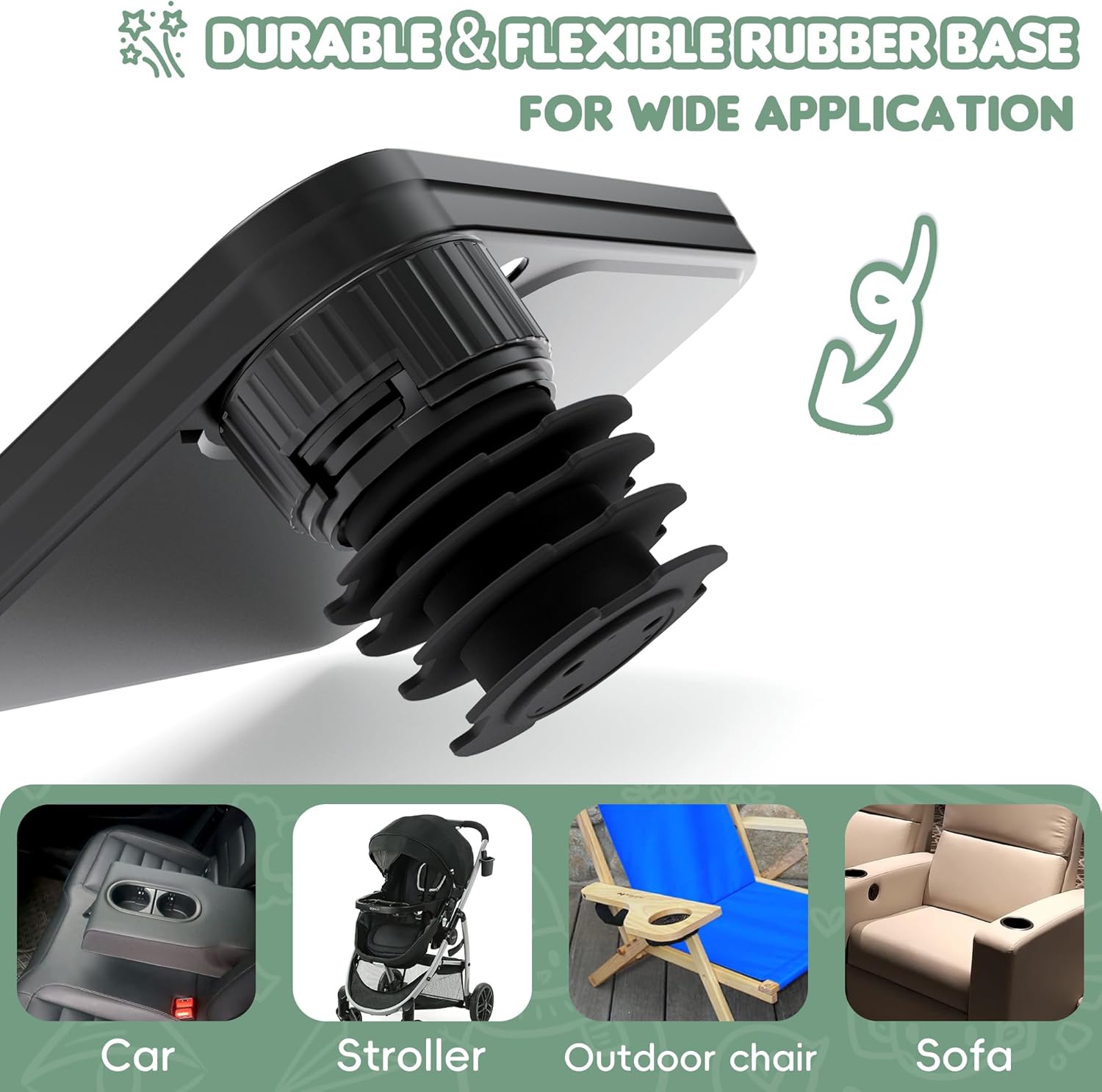 - KID-FRIENDLY MATERIAL: The tray part is made of advanced food-safe ABS plastic, sturdy and kid-friendly for long time using, and has an anti-slip design, which effectively prevents snacks and drinks from sliding off, ensuring that the car is clean and tidy. Whether it is a water cup or a small toy, the tray can be firmly fixed.The base is made of durable rubber, which makes the tray installed firmly in the cup holder and prevent it from falling easily.