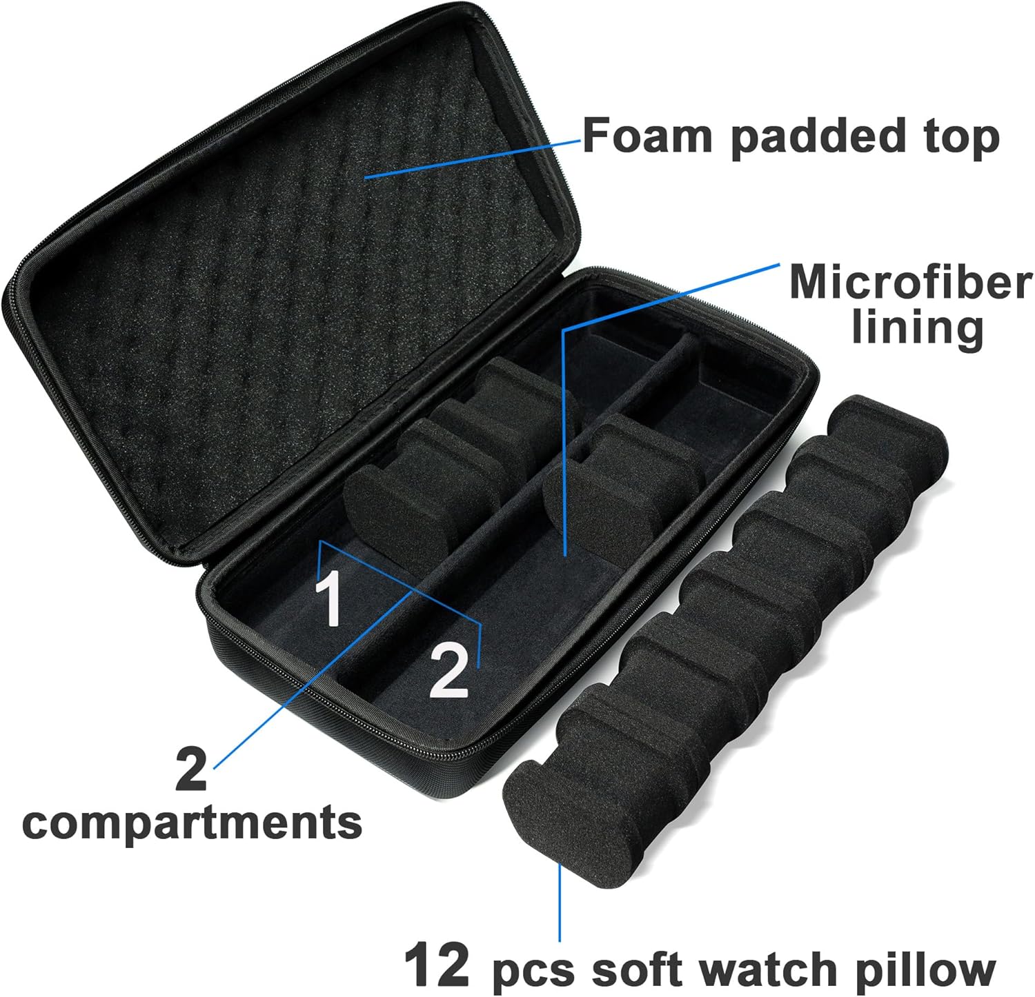 - Custom sponge watch pillow providing extra protection for watches, keep watch well in place; Inside the watch case, you'll find the soft and form-fitting watch pillows that accommodates watches of various sizes. The compressible feature allows the pillow to conform to the shape of your watches, ensuring a snug and secure fit. This not only prevents the watches from moving around during transport but also keeps them protected from scratches and other potential damages.