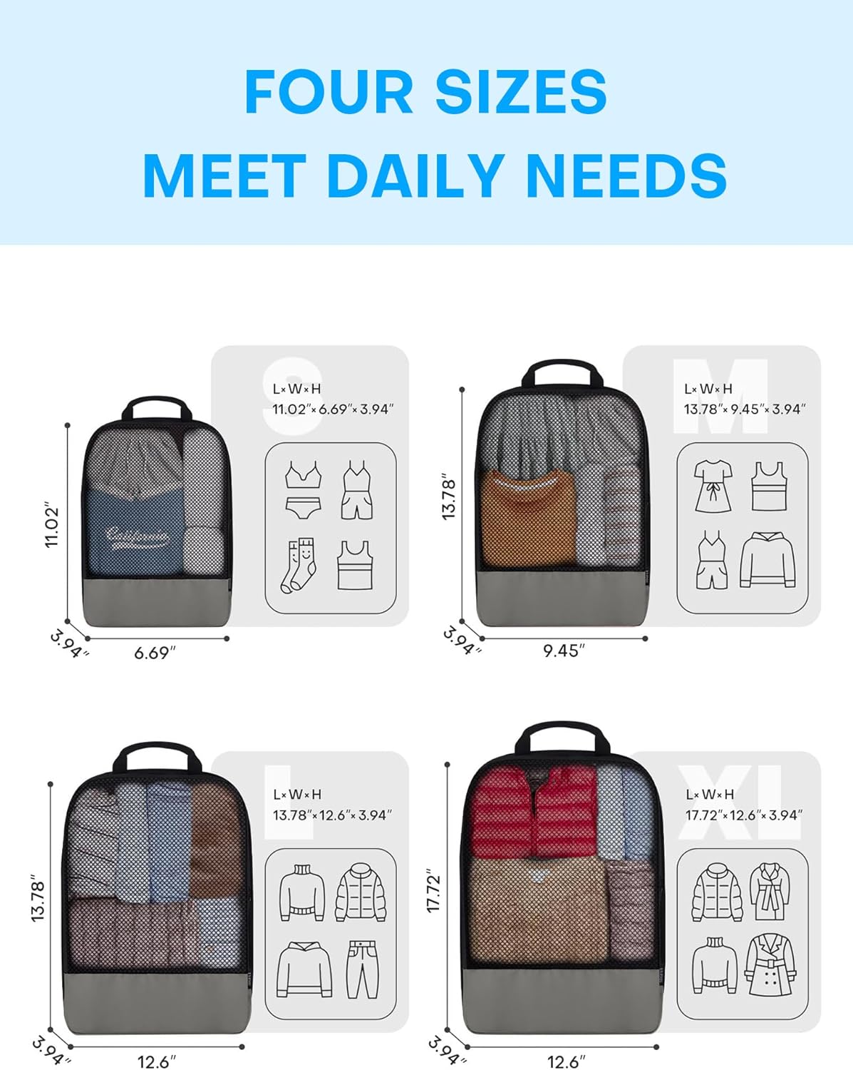 4 PCS Set Compression Packing Cubes for Travel, Lightweight Packaging Organizer Bags for Carry On Space Saving, Travel Essentials Cubes for Suitcase Backpack, Grey