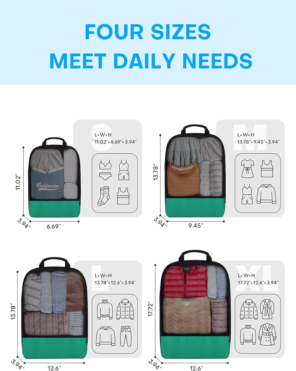 - Versatile & Flexible: Our packing organizer features 4 different sizes organizers for different items: L-M-S-XS for essentials like jackets, shirts, spants, underwear, toiletries, and more. Laundry bag keeps soiled clothing separate.