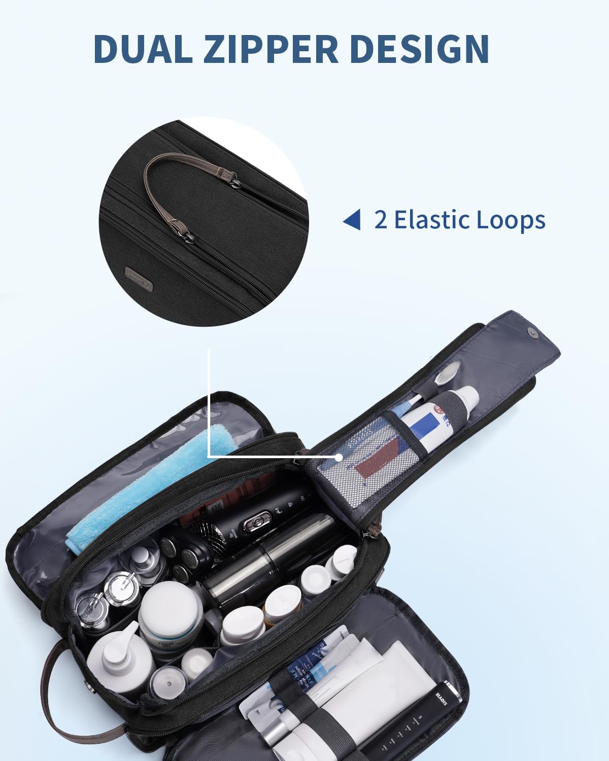 - 【Stay Organized on the Go】: Available in two sizes, the Medium (9.4''L x 5.9''H x 5.5''W ) and Large (11.5''L x 6.3''H x 6.5''W ) toiletry bags fit all your travel essentials. The Medium size is perfect for individual use, while the Large size offers ample space to hold toiletries for the whole family. The mesh pockets keep bottles upright, and two elastic loops in the lid help secure items like toothbrushes or razors.