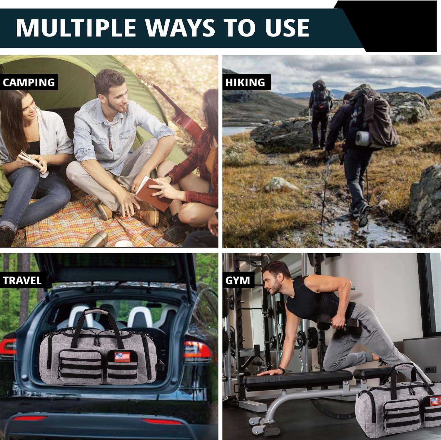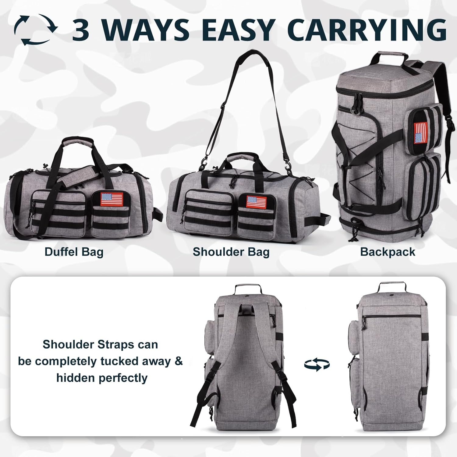 - 【Large Multiple Pockets Gym Bag】Featuring a spacious main compartment and 2 large inner mesh pockets, Travel duffel backpack also includes a dedicated shoe compartment and wet pocket on each side. The front showcases 3 pockets with webbing and a flag patch, while the back has a convenient luggage sleeve pocket. With an adjustable top lanyard, two long haul handles, a grab handle, and a removable shoulder strap, you can carry this bag in multiple comfortable ways.