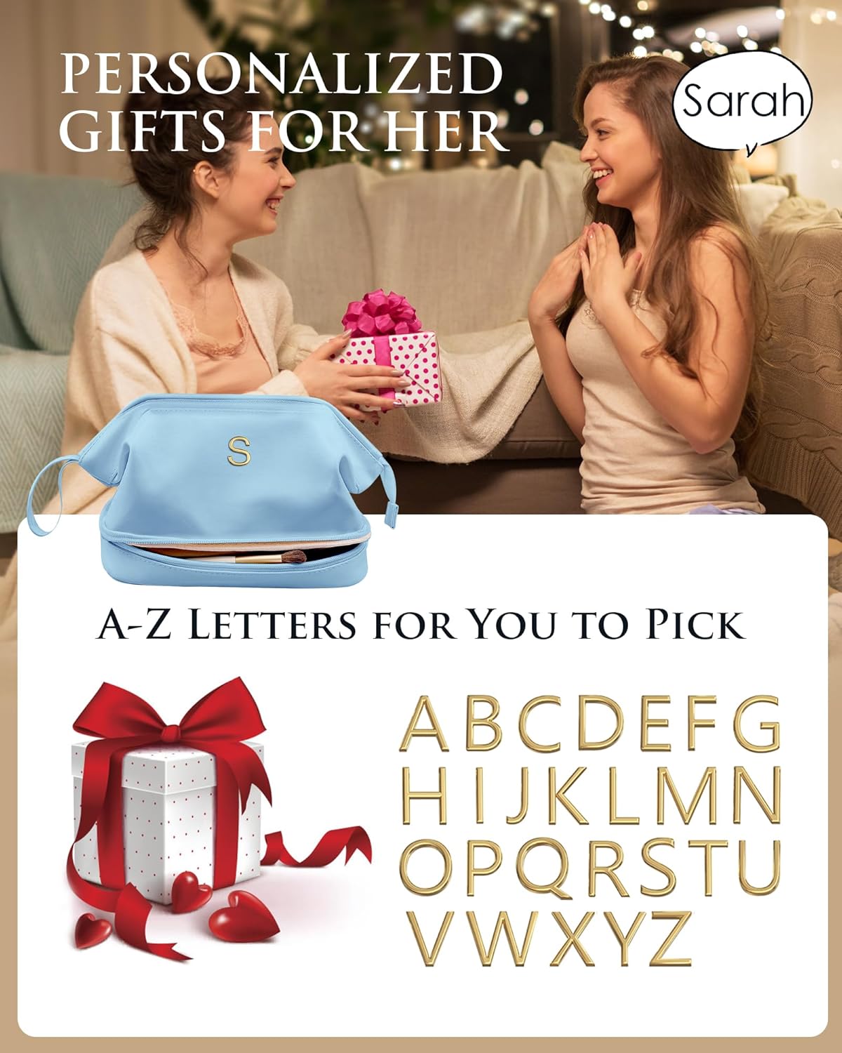 Birthday Gifts for Women, Initial Large Makeup Bag, Personalized Double Layer Cosmetic Bag with Makeup Brush Organizer, Waterproof, PU Leather Travel Toiletry Bag,Bride Gift Monogrammed Gifts