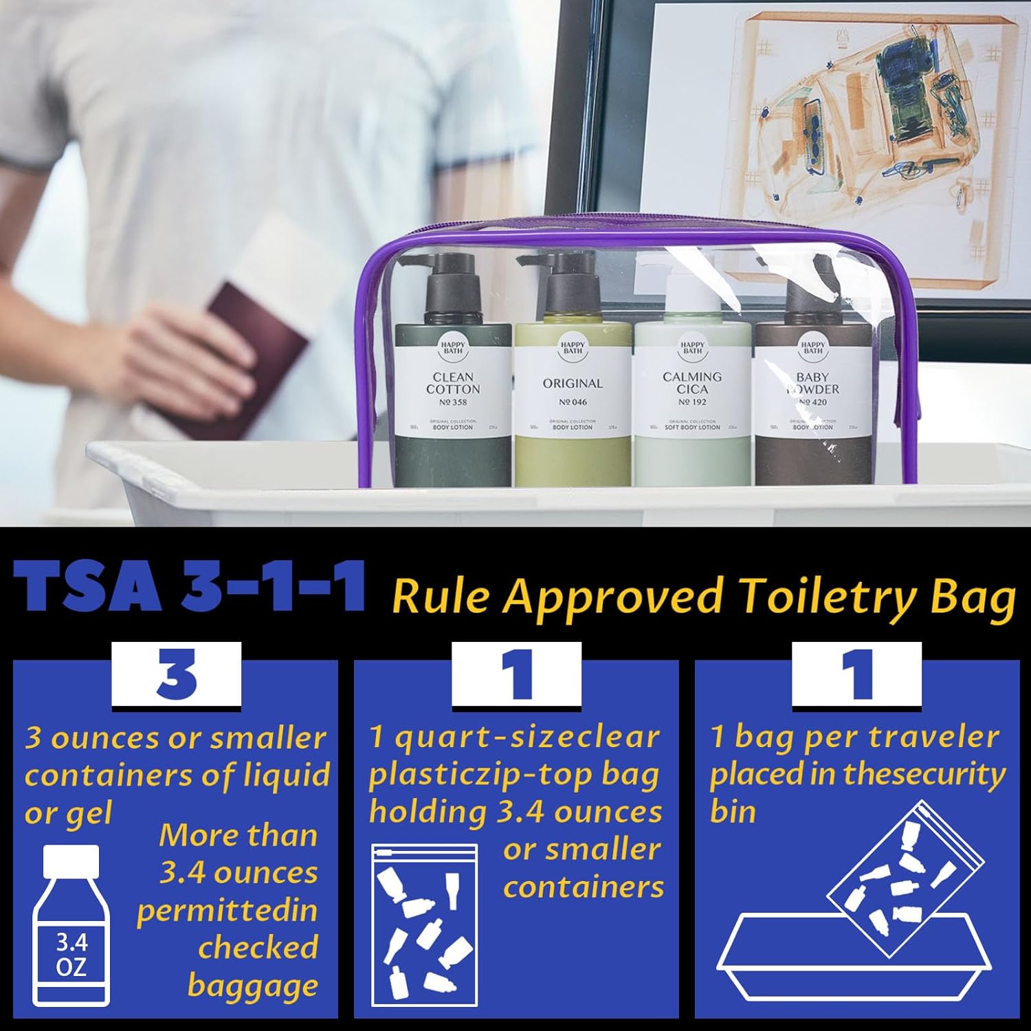- TSA Approved Clear Toiletry Bag Carry-On Size: Our Bag Size of each is about 7.28"x 2.36"x 5.11"(18.5 X 6 X 13CM). Weight: 0.055lb/ 25.3g. you can carry them anywhere, the enough capacity is suitable to store your small items like lipsticks, pencil, eyeshadow and other things; These clear travel bags for toiletries strictly follow 3-1-1 liquids rules for carry-on bag of all airlines. Easy and quick to pass through airport security.