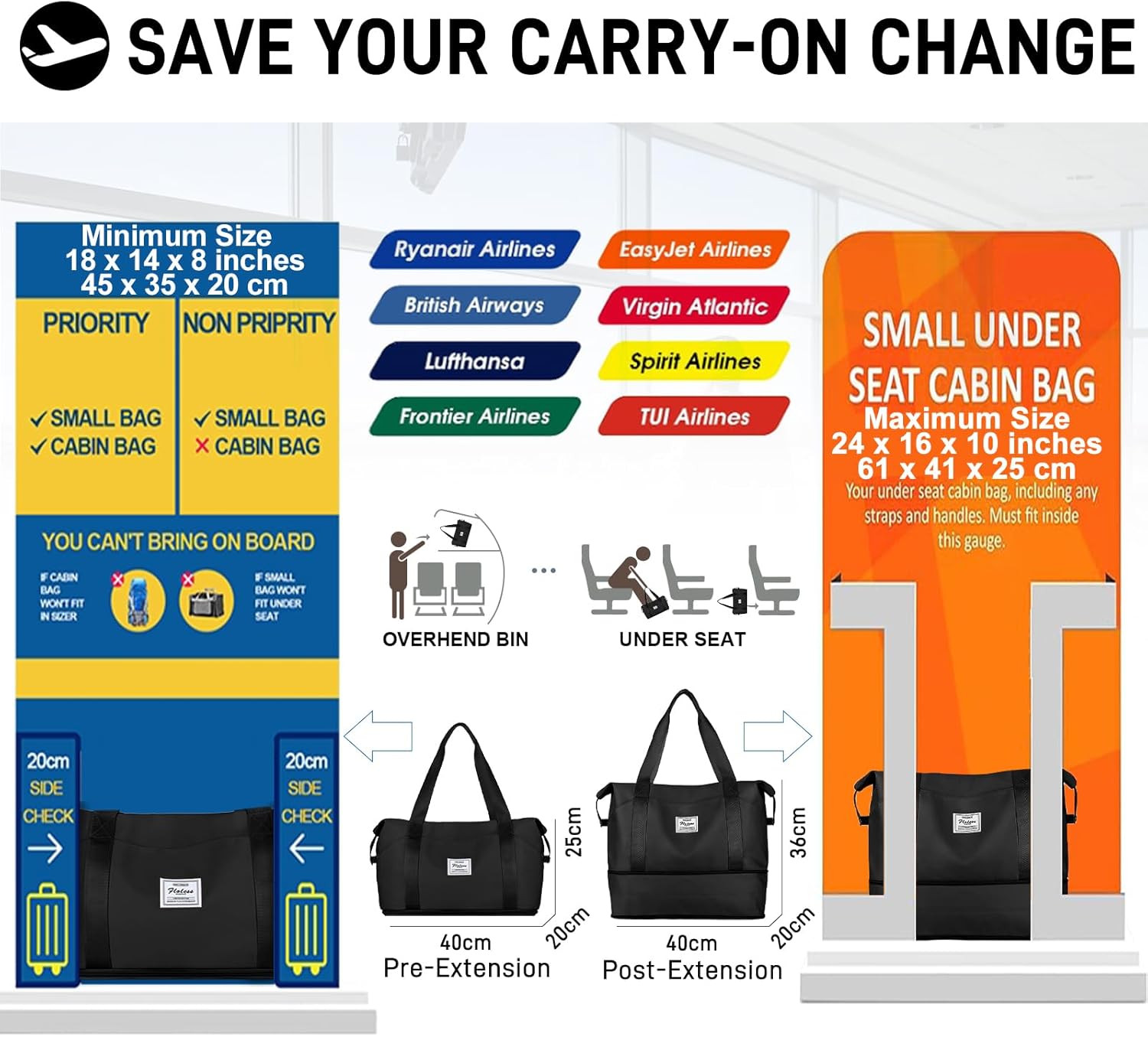 • 🌞 EASY CARRYING - The external storage pocket provides quick access to small items. The pouch doubles as a strap, allowing the duffel to fit over the handles of common suitcases (18, 20, 24, 26, 28, and 32 inches) for easy transport.