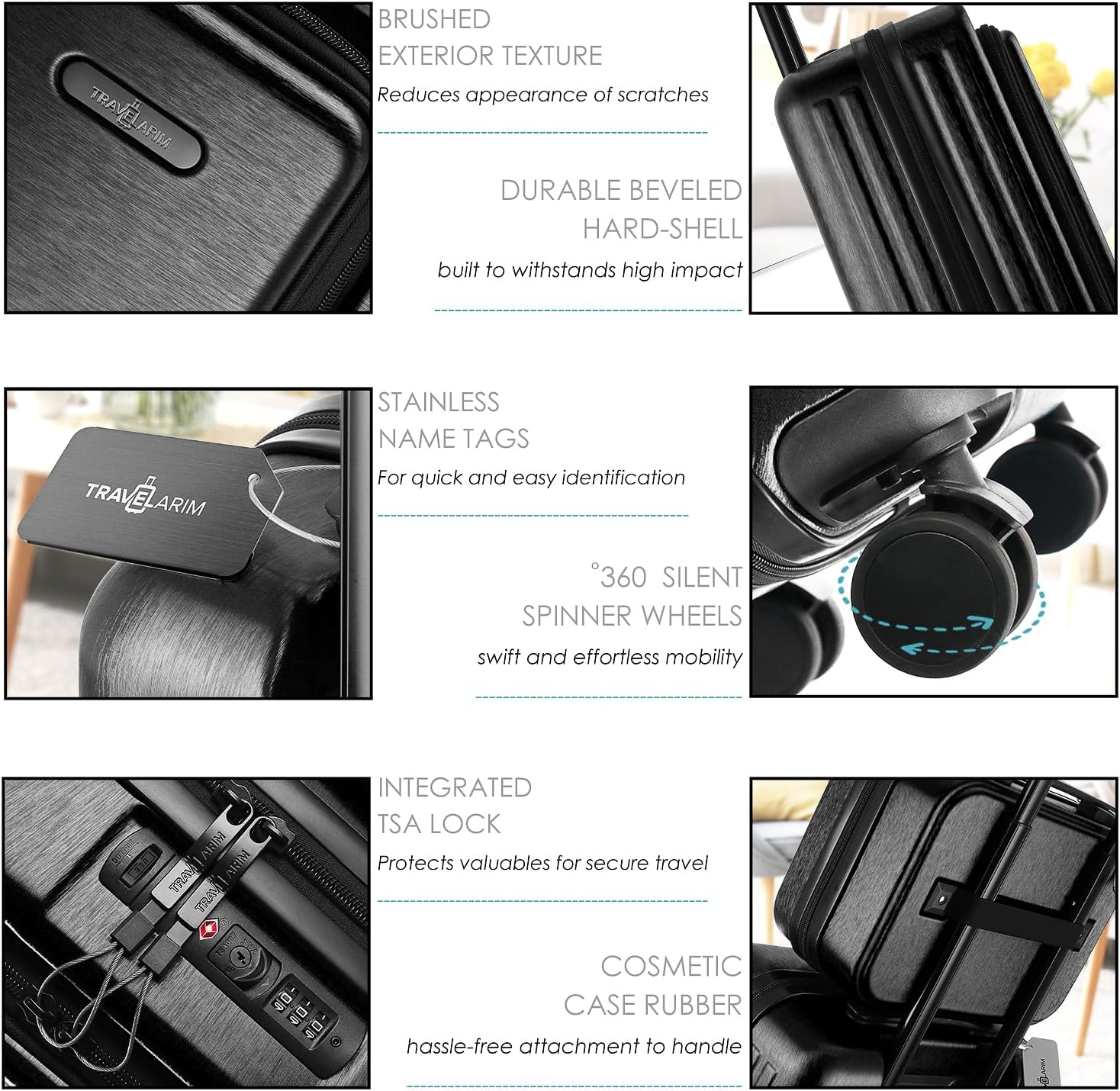 - Carryon Luggage with Spinner Wheels: Rolling carry on luggage for plane travel includes 4 spinner wheels that provide you with smooth, gliding 360 movement, a telescoping handle, stainless steel name tags, and TSA lock to secure your belongings.