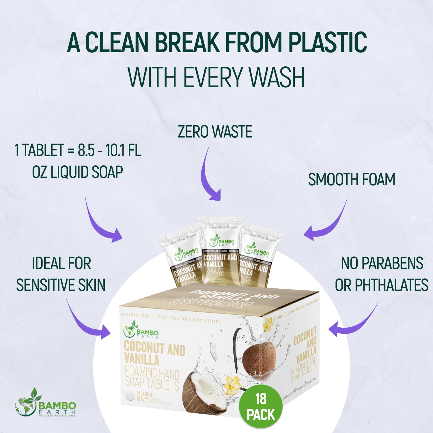 18 Pack Natural Foaming Hand Soap Tablets - Soft Moisturizing Handwash Tab Refills - 1 Tablet = 9 Oz Refillable Liquid Wash Foam Handsoap - Eco-Friendly Paper Softsoap Refill Tabs (Coconut & Vanilla)
