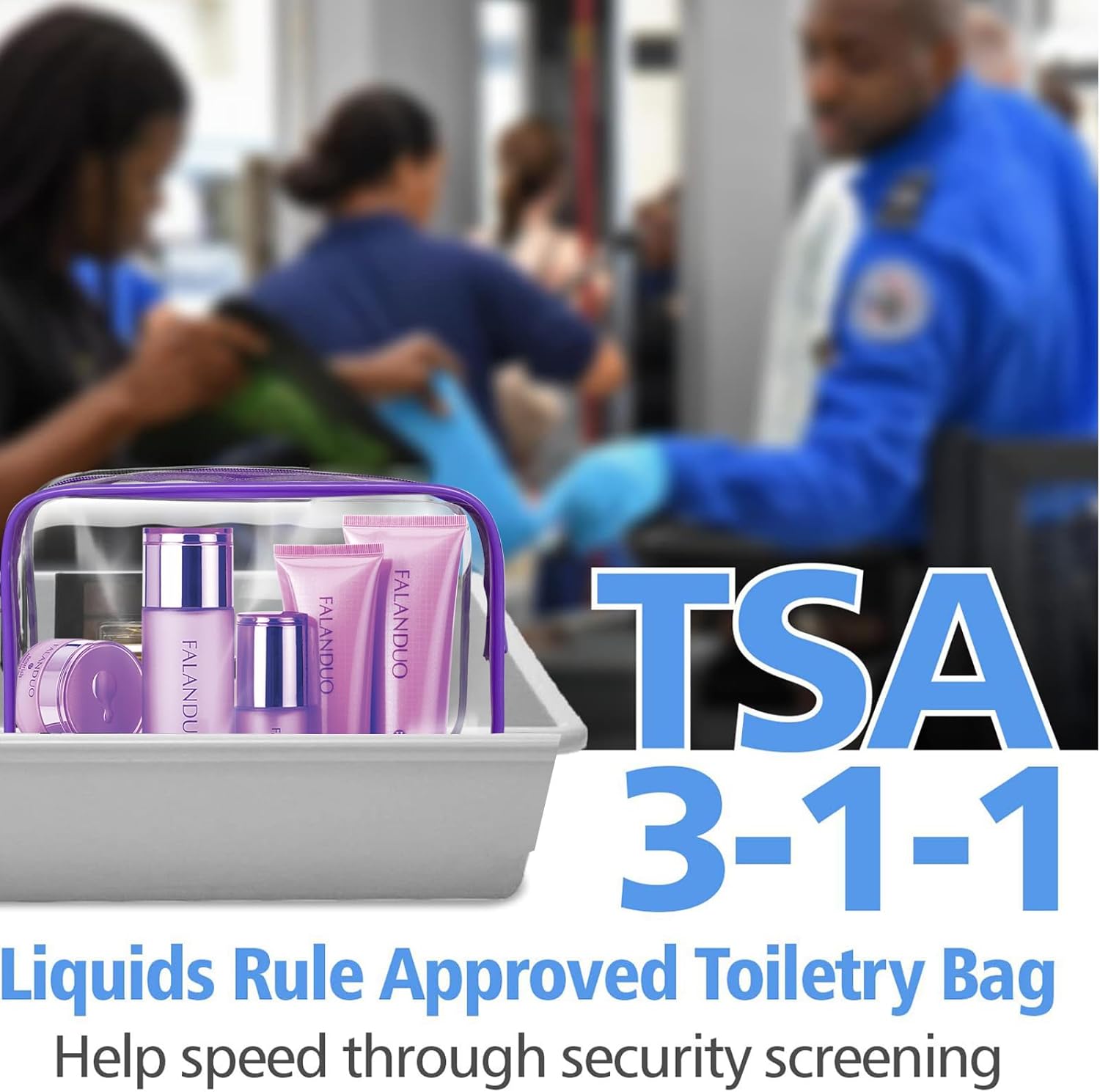 - TSA APPROVED TOILETRY BAG: The TSA certified clear toiletry bag strictly follow 3-1-1 airport regulations, so you don't have to worry about getting through airport security. Clearly see-through to quickly spot whatever you need and pass the security without opening the toiletry bags.
