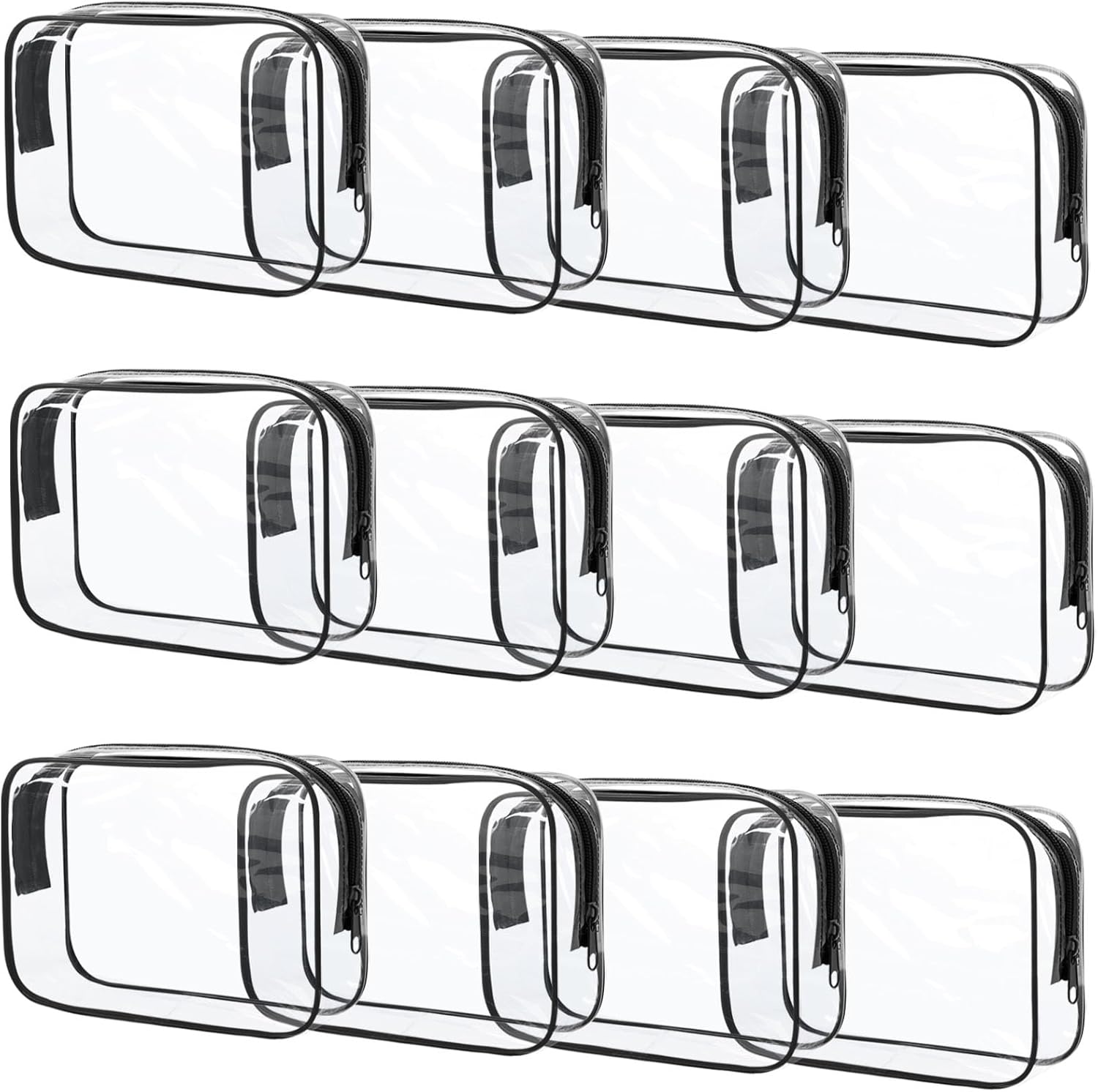 12 Pcs Clear Toiletry Bag PVC Waterproof Zippered PVC Cosmetic Makeup Carry Pouch TSA Approved Toiletry Bag for Travel Clear Organizer Storage Bags (Medium, Black)