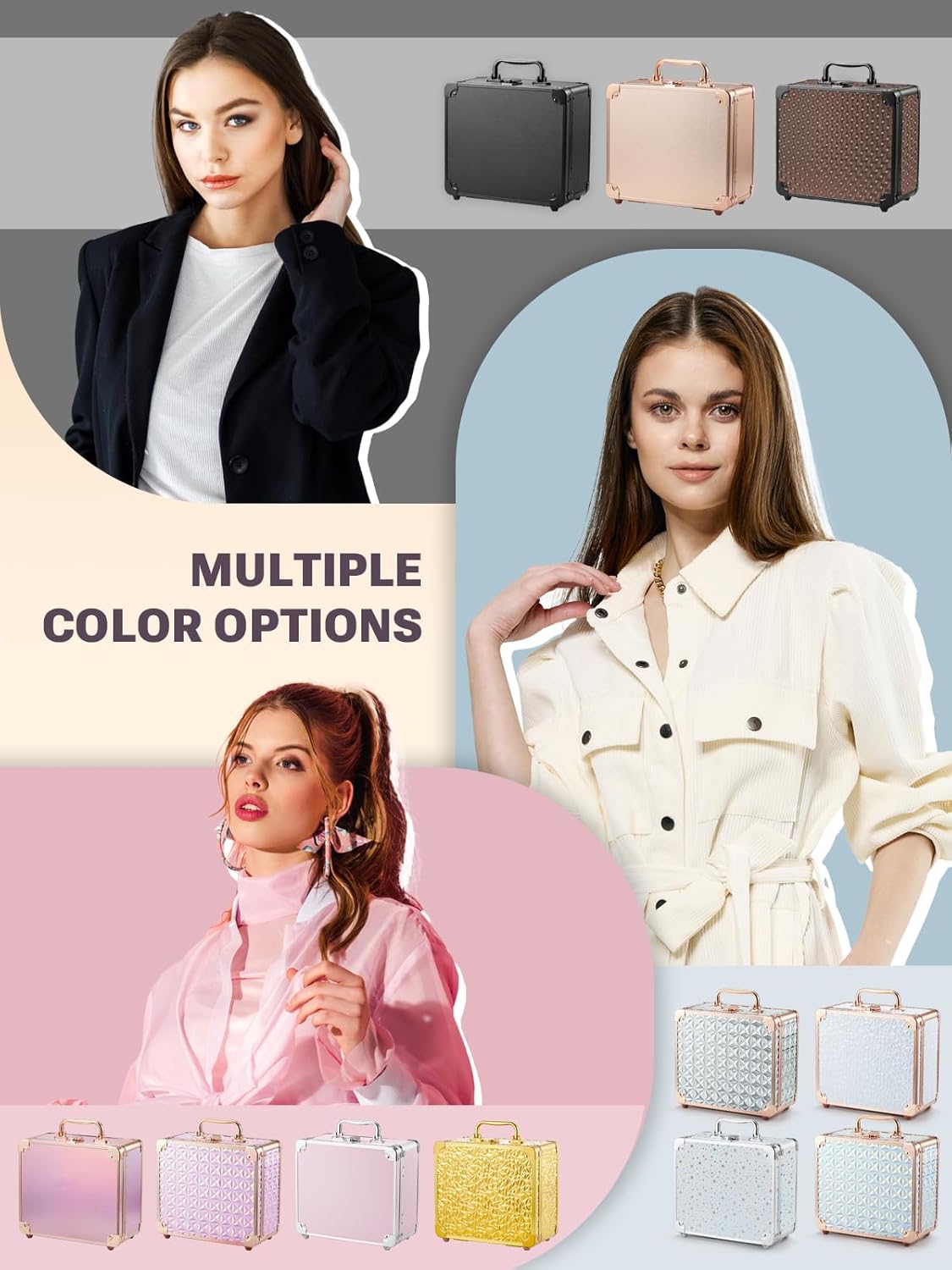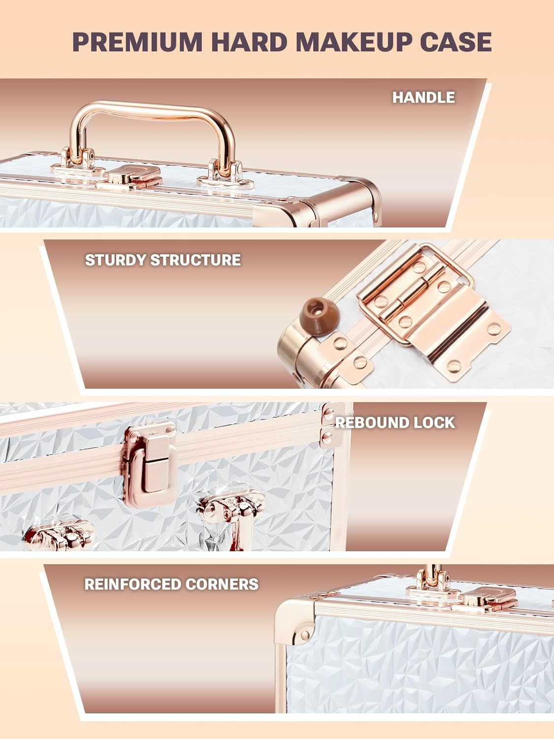 - Professional Hard Makeup Travel Case: Measuring 9.6x8.3x4.9 inches, this portable case is ideal for all makeup artists. Made with cardboard and metal-reinforced corners for durability, it features a latch with a quick rebound lock