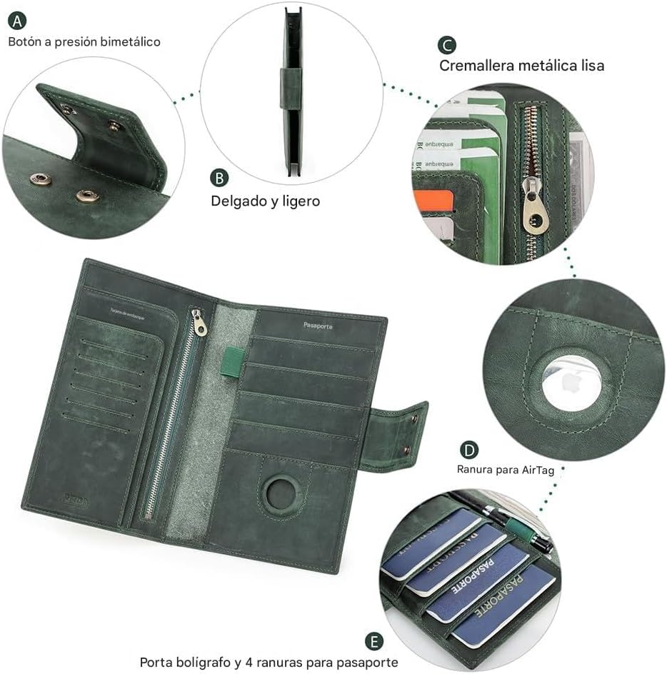 - Compact Size: 8.66 x 5.9 x 0.39 inches, 22 x 15 x 1 cm. Dark green large capacity passport wallet for 4 with rifd anti-theft come with 4 passport compartments, 6 credit card slots, 2 boarding passes slot, 1 airtag slot, 1 zipper coin pocket, 1 pen slot and 2 cash slots