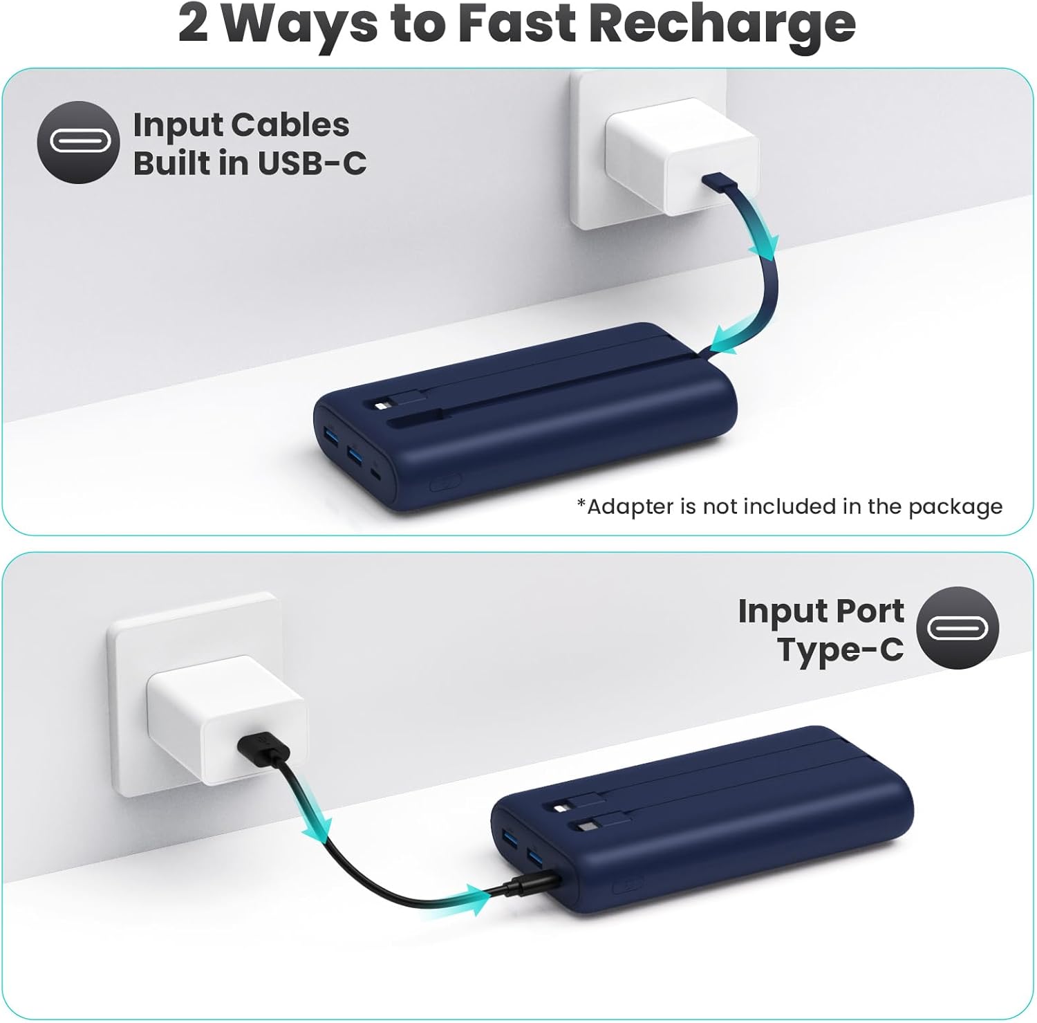 Portable Charger Power Bank 40,800mAh 25W Fast Charging USB C Portable Charger with 2 Built in Cables,5 Outputs & QC 4.0 Quick Phone Charging Battery Pack Compatible with iPhone 16/15/Android (Blue)
