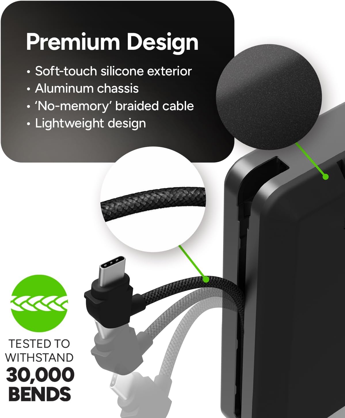 - MULTIPLE DEVICE CHARGING: Charge up to three devices simultaneously using the USB-C port and integrated Lightning and USB-C cables. This allows you to keep your smartphone, tablet, and other devices powered up at once, ensuring all your gadgets are ready to use