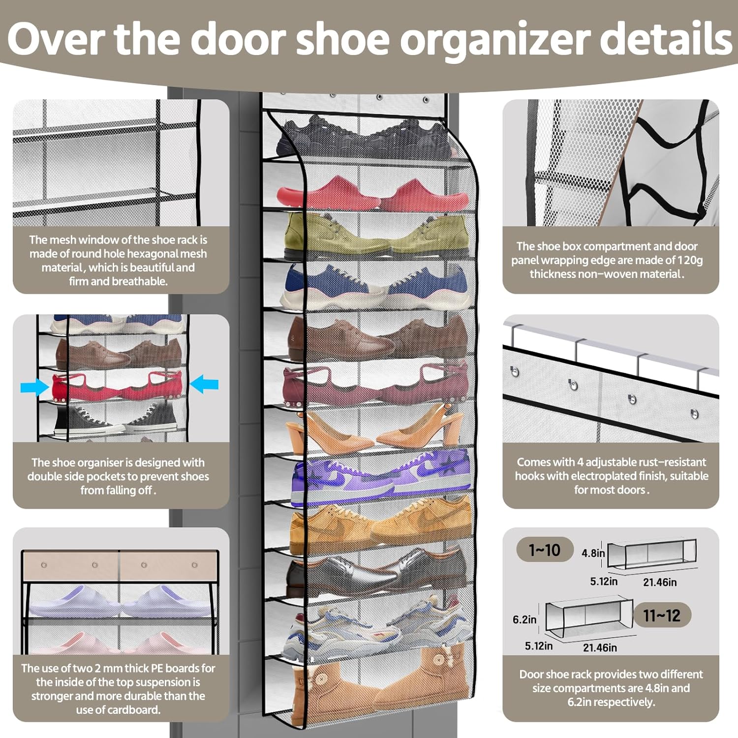 - 🥾👒👘【MULTI-SITUATION USE AND FITS MOST DOORS】This hanging shoe bag can not only be installed in halls, bathrooms, nurseries, foyers, closets, bedrooms, but also in closet doors, pantry doors, locker doors, bi-fold doors in your home, cruise ships, campgrounds, college dormitories, classrooms, travels, etc., according to your needs to be installed in different places. The shoe rack comes with 4 non-slip and durable hooks that are adjustable according to the thickness of the door, suitable for doors with a thickness of 1.37“-1.65”, fits perfectly with most doors.