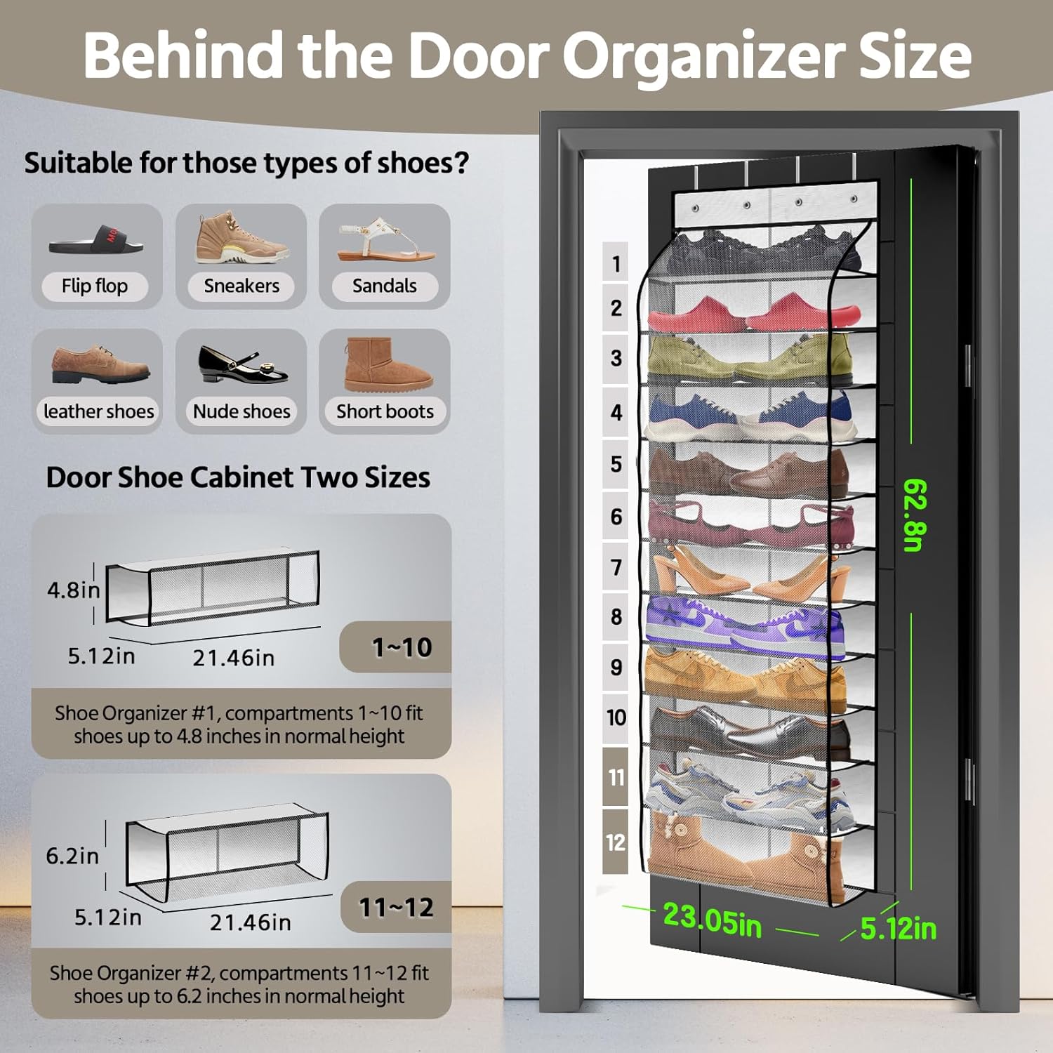 - 🥾👒👘【DURABLE AND PREMIUM QUALITY MATERIALS】The door hanging shoe organizer is made of high quality thickened and breathable non-woven fabric with 12 large pockets that can hold tennis shoes, men's sneakers, boots, hiking shoes, high heels, children's shoes and sandals, etc., in addition to 4 sturdy and durable hooks and two dividers placed on the first level, which can hold up to 70 lbs. when hanging on the back of the door. The hanging bag folds up and can even be taken with you on the go, so you can easily organize your belongings when you travel.