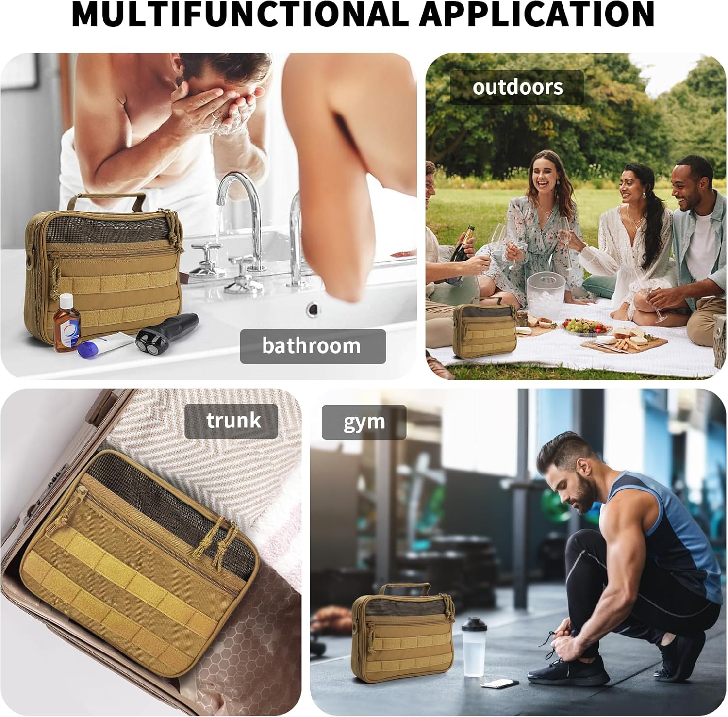 - Convenient Hanging: Our hanging Toiletry Bag Equipped with a comfortable handle and a convenient hook that allows you to easily suspend it from towel racks, coat hooks,bathroom door, or any other convenient spot,convenient for access and saving space. It also has an adjustable string for hanging from door handles or branches. The top handle makes it easy to carry, and the Molle design of the front pocket allows for additional attachments.