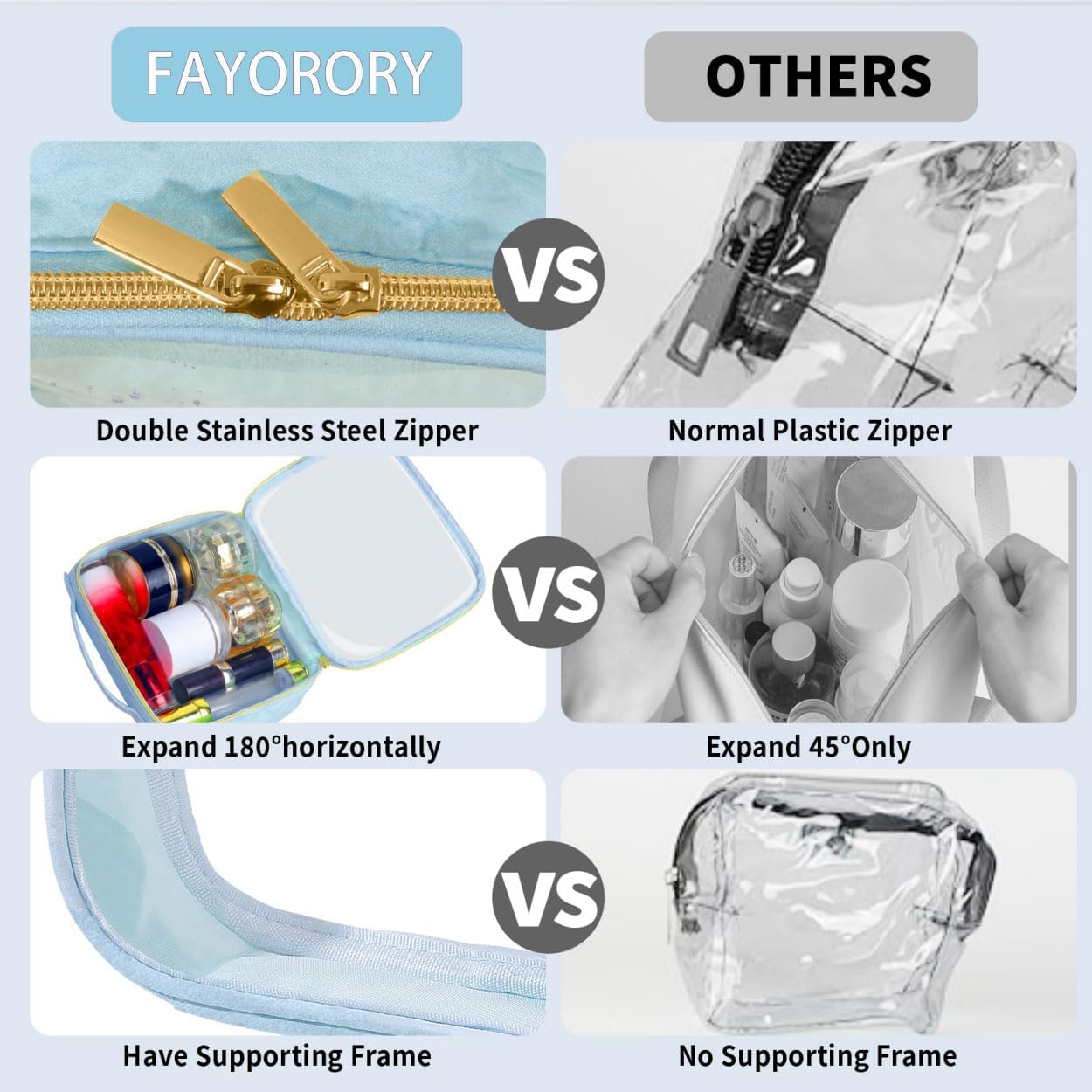 - 【Premium Materials】: FORXIFFA travel makeup bag is constructed from double-layered 60 Silk transparent PVC plastic and premium water-resistant fabric,ensuring the makeup travel bag is waterproof and easy to clean.Each bag's seams are reinforced,and the water-resistant fabric provides excellent toughness,preventing the clear travel bags for toiletries from deforming even under pressure.What a best travel essentials!