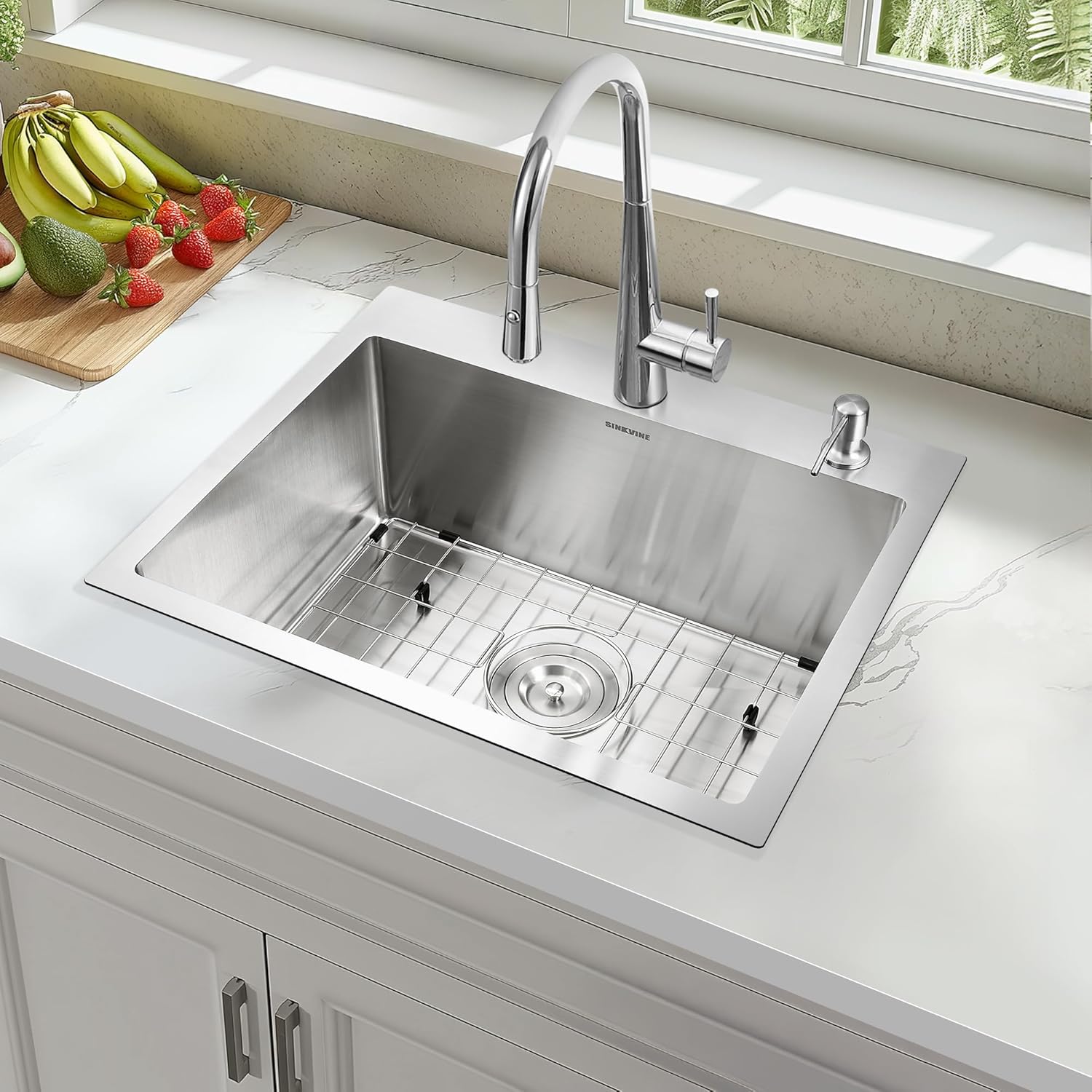 22 Inch Drop-In Kitchen Sink, SINKVINE 22" x 18" Stainless Steel Indoor and Outdoor Sink, Top Mount Deep Single Bowl Sink for Laundry, Wet Bar, RV, w/Drain Strainer, Bottom Grid, Roll-up Drying Unit