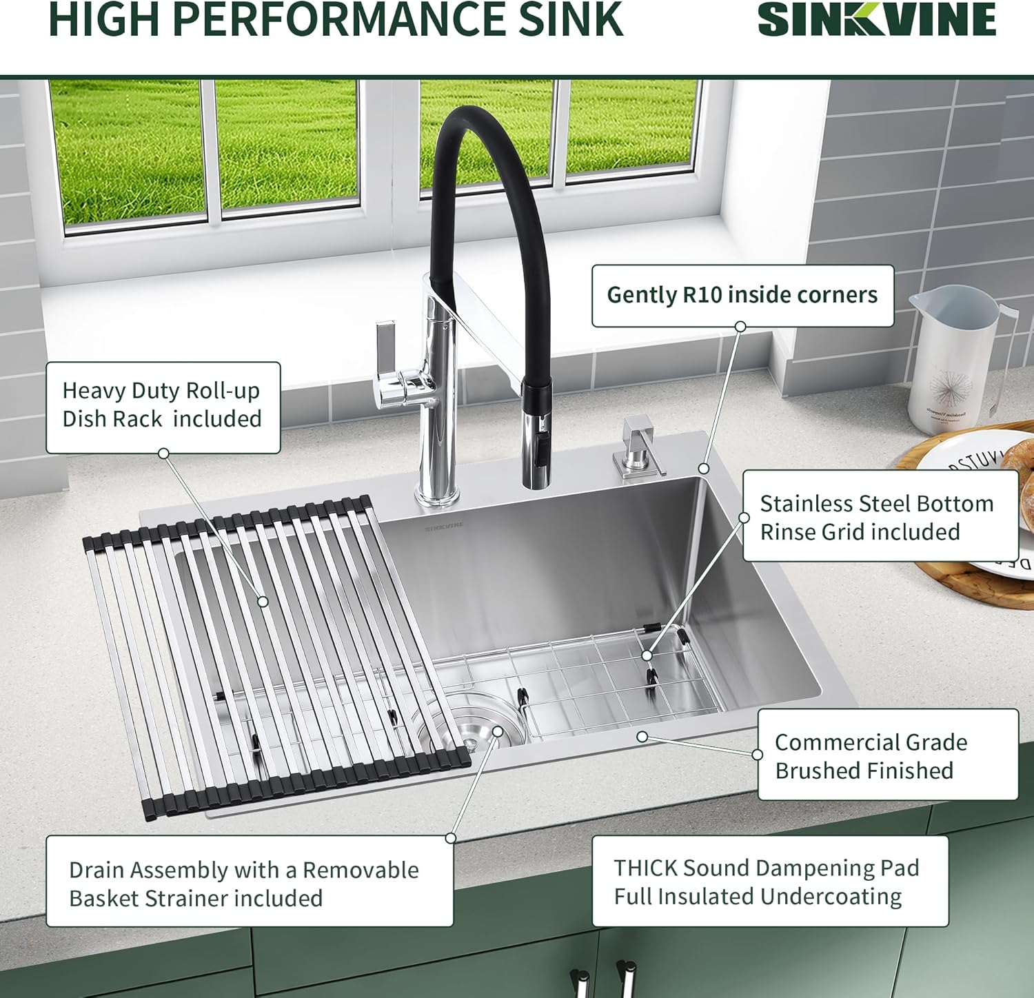 - KIT INCLUDES: 22" Kitchen sink, roll-up dish drying rack, bottom rise grid protector, drain assembly w/ removable strainer - Installation-ready sink comes with cut-out template for drop-in installation - Backed by SINKVINE LIFETIME LIMITED WARRANTY