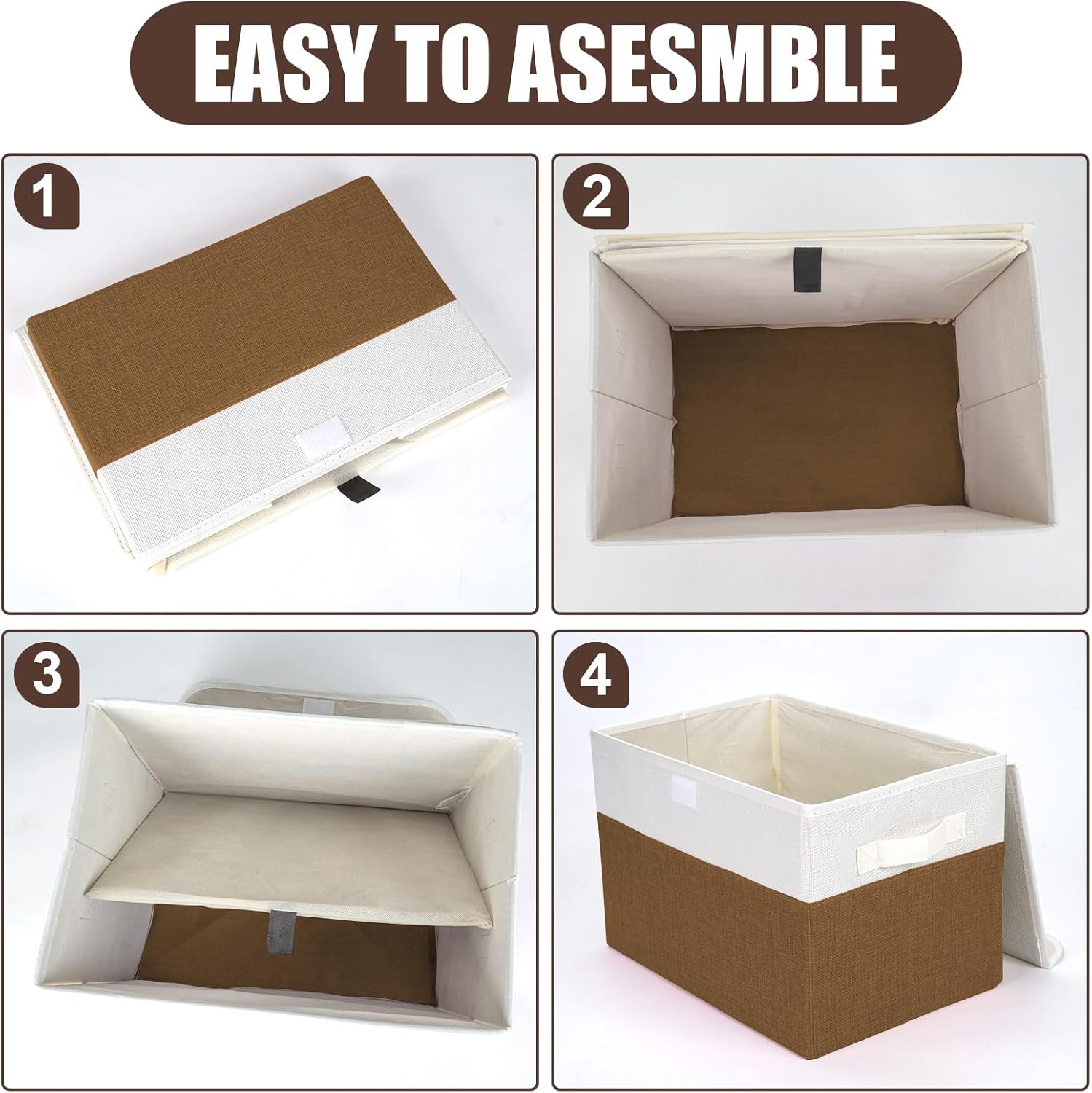 Large 22 Quart Linen Fabric Foldable Storage Bin Cube Organizer Basket with Flip-Top Lid & Handles, Clothes Blanket Box for Home, Office, Closet, Brown & White, 4 Pack 14.6 x 9.5 x 9.5