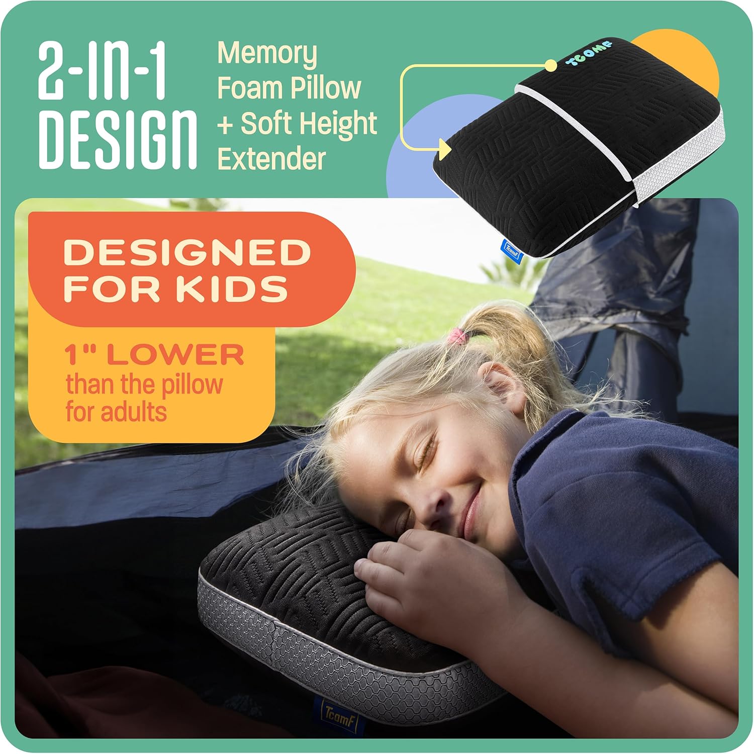 Kids Camping Pillow: Dual-Cover Memory Foam Small Pillow; Medium-Firm Camp Pillow | Mini Pillow w/ 5 Layers for Comfort and Support; Small Travel Pillow/Compact Pillow 10x16 Inches (Black)