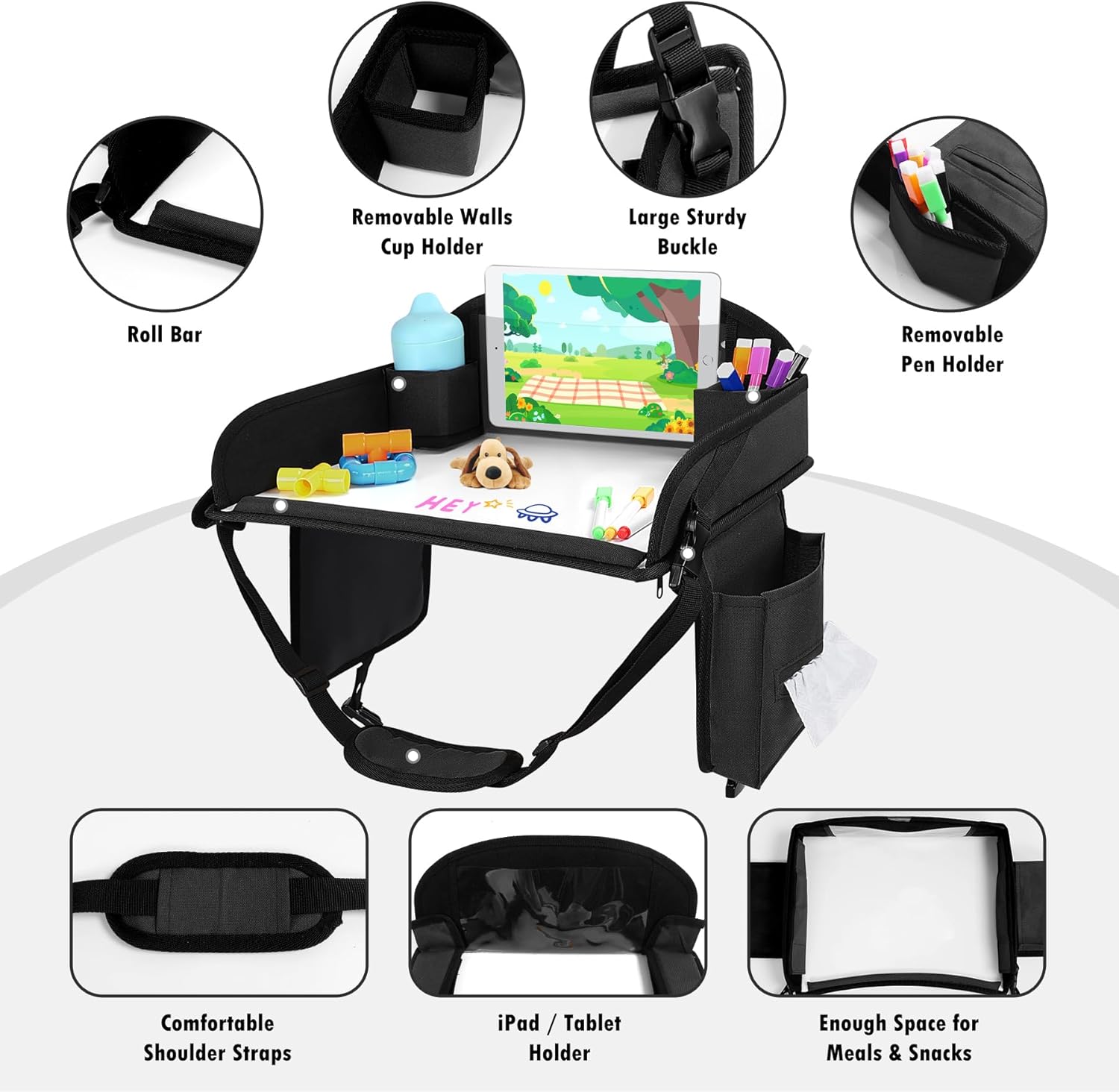- Multi-Function Travel Tray For Kids Car Seat: Our car tray for kids features convenient organizational pockets to hold your kids small cards, and a built-in portable tissue holder for easy access. The car seat tray also includes a cup holder, keeping drinks within reach, while the raised edges prevent snacks, pens, or toys from falling off. More than just a wipe-clean drawing surface, car seat tray doubles as a snack tray—so kids can eat and play without switching spots!