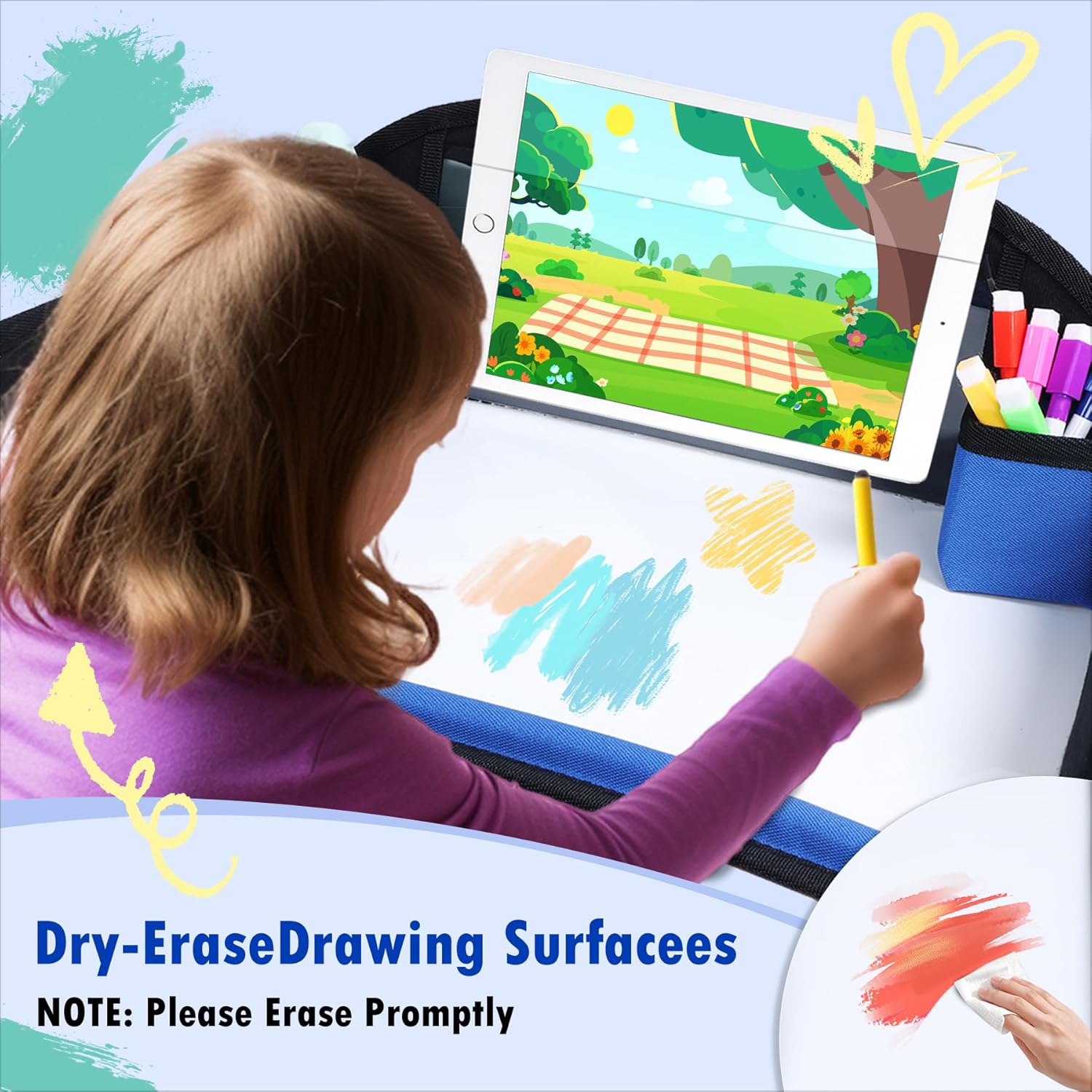 - Multi-Function Travel Tray For Kids Car Seat: Our car tray for kids features convenient organizational pockets to hold your kids small cards, and a built-in portable tissue holder for easy access. The car seat tray also includes a cup holder, keeping drinks within reach, while the raised edges prevent snacks, pens, or toys from falling off. More than just a wipe-clean drawing surface, car seat tray doubles as a snack tray—so kids can eat and play without switching spots!