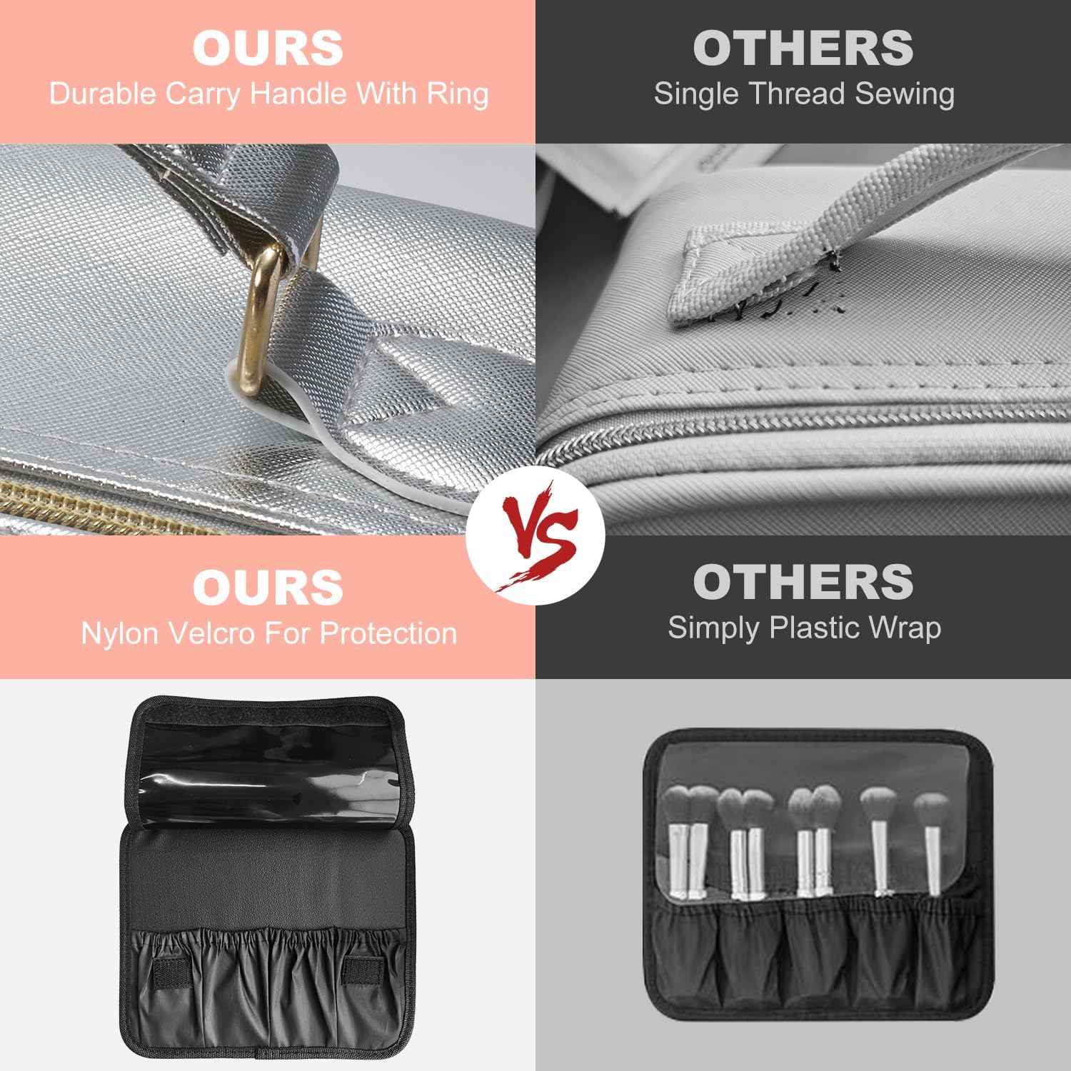 - 👍【Flexible and Large Storage Space】:Reasonable design makes the makeup bag easy to carry, not only can you store cosmetics and makeup tools, but also jewelry, electronic accessories, camera accessories, toiletries, etc. Removable EVA sponge divider Can DIY the space you need to meet your needs. Can accommodate a variety of sizes of cosmetics and makeup brushes. Which can well protect the cosmetics inside, ensure no breakage or leakage, and also keep them clean and dry.