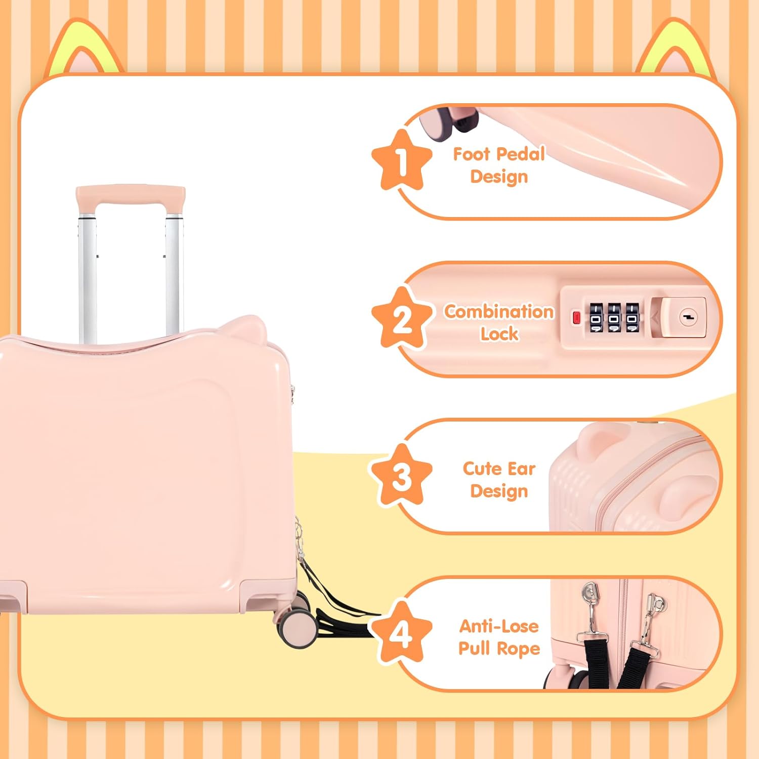 20" Ride-On Travel Suitcase for Kids, Cute Ear Toddler Carry on Luggage with Spinner Wheels & Anti-Lose Rope, Children Rolling Trolly Luggage with Password Lock (Pink with Rope)