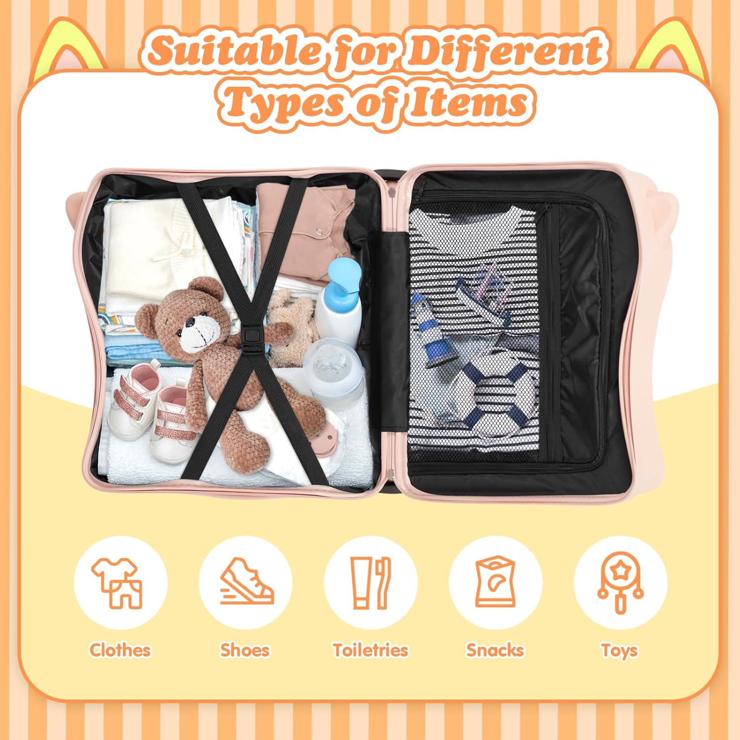 - 【Large Storage Space】Toddler riding carry on suitcase has a large zippered compartment that can separate and store items, making it convenient for you to package essential travel items; Perspective mesh pockets can store smaller items